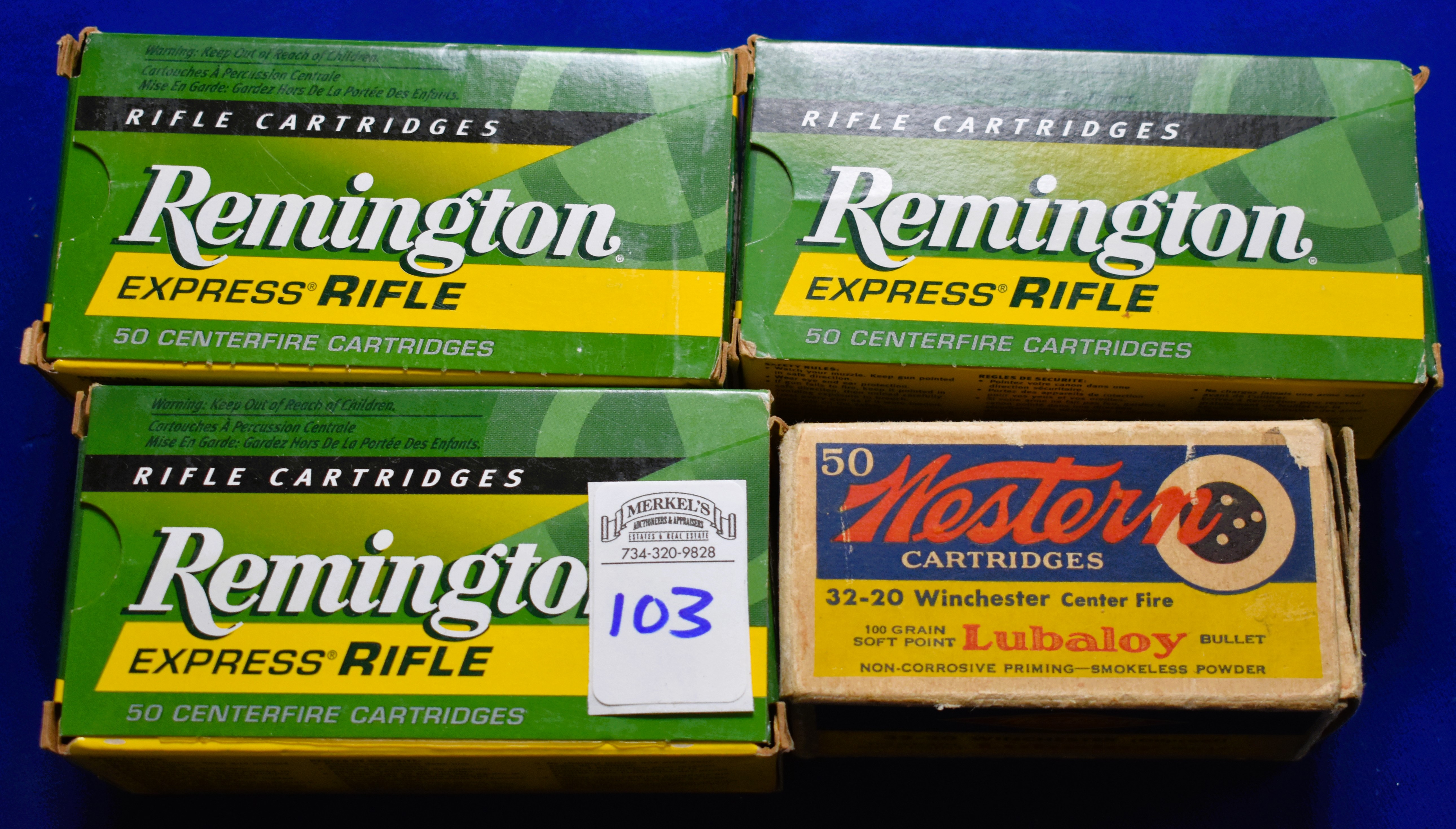 Factory New Old Stock -200 Rounds (4 Boxes) 3 boxes of Remington 32-20 Win gr. 100. 1 box of Wester 32-20 gr. 100. Shipping ONLY UPS GROUND due to regulations.