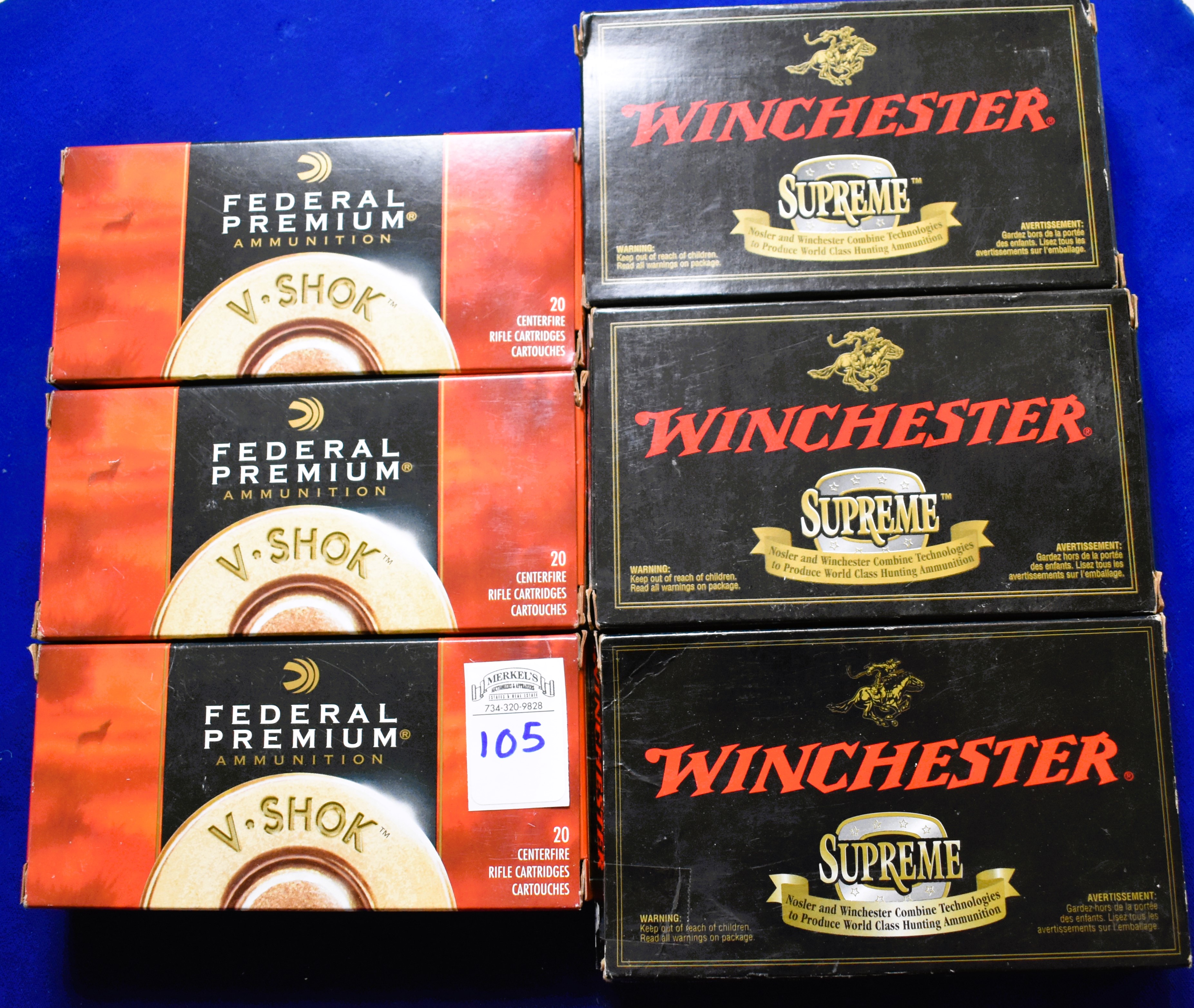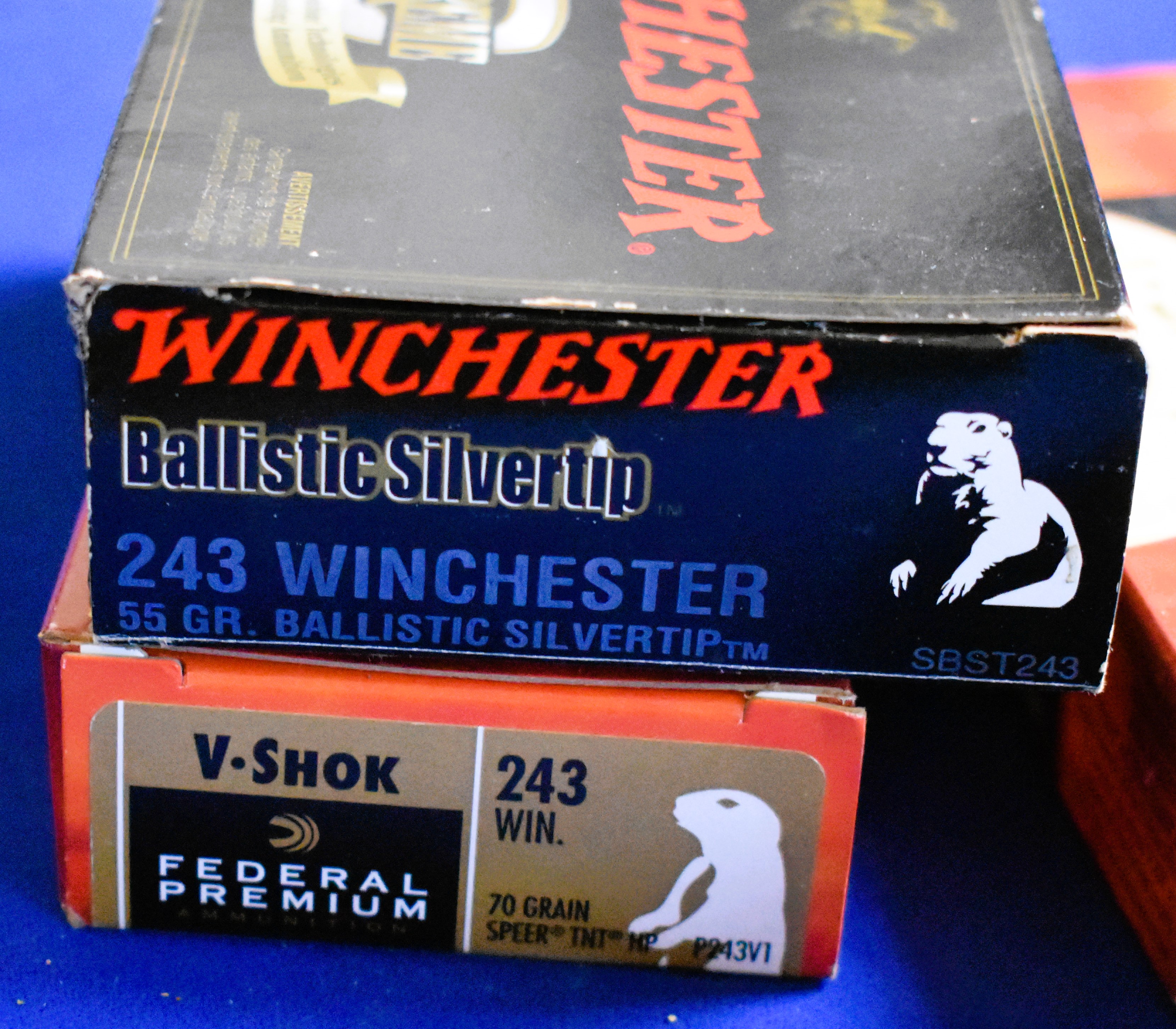 Factory New Old Stock -100 Rounds (5 Boxes) 3 boxes of Federal Premium 243 Win. gr. 70, speer TNT HP. and 2 boxes of Winchester 243 Win. gr. 55 Ballistic Silvertip. Shipping ONLY UPS GROUND due to regulations. These are 20 Round boxes.