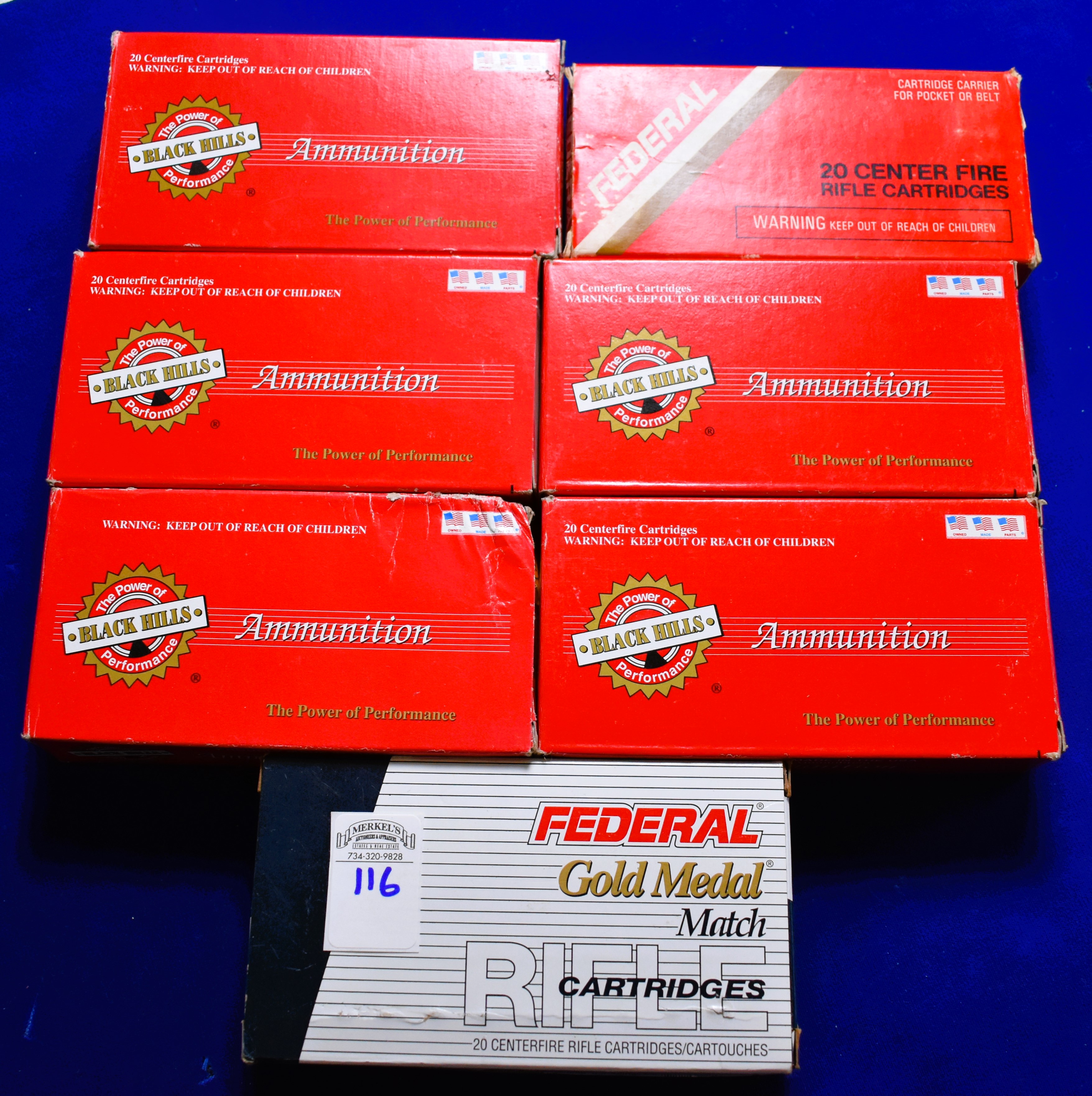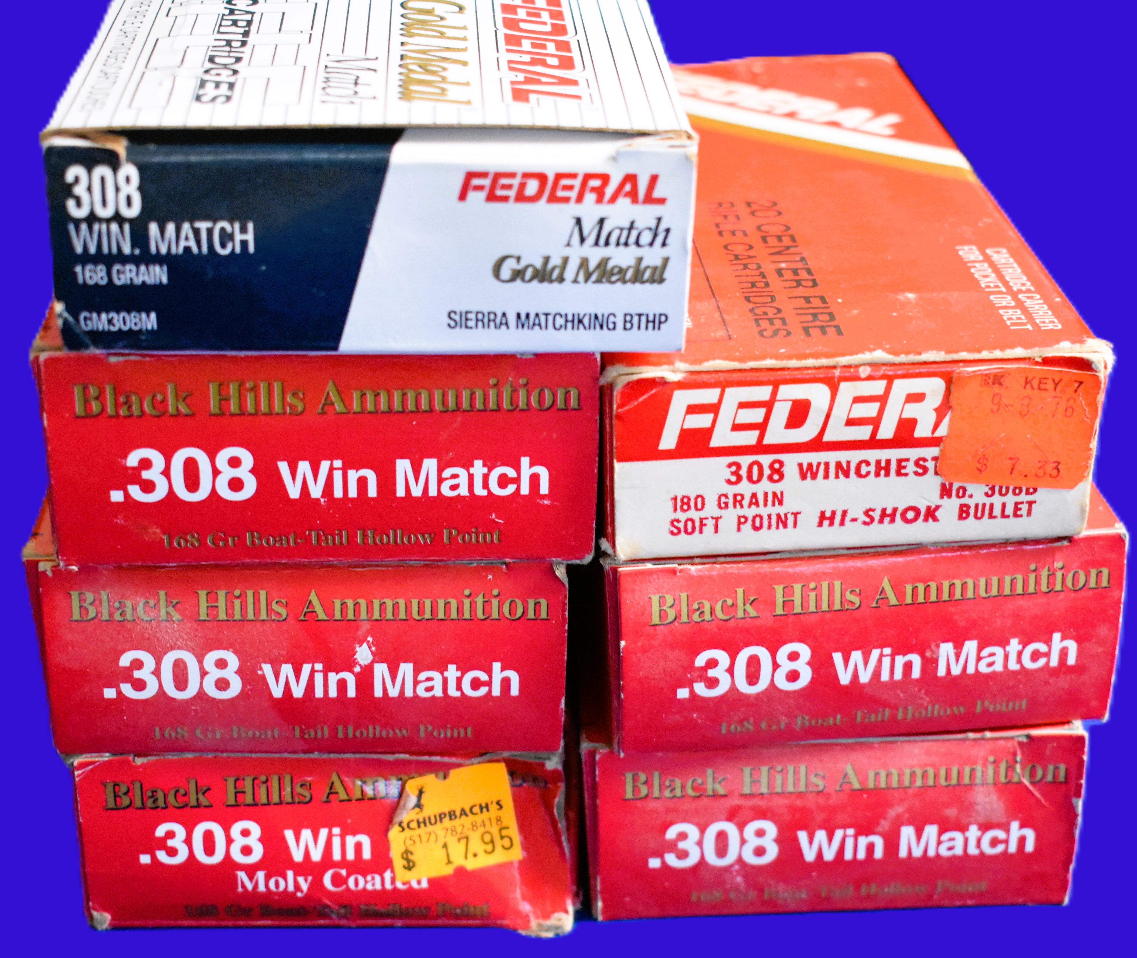 Factory New Old Stock -120 Rounds (6 Boxes) 5 boxes – Black Hills 308 Win Match, Moly Coated 165 gr. boat-tail HP. 1 box – Federal Gold Medal 308 Win Match, 168 gr. Sierra Matchking BTHP. Shipping ONLY UPS GROUND due to regulations. These are 20 Round boxes.