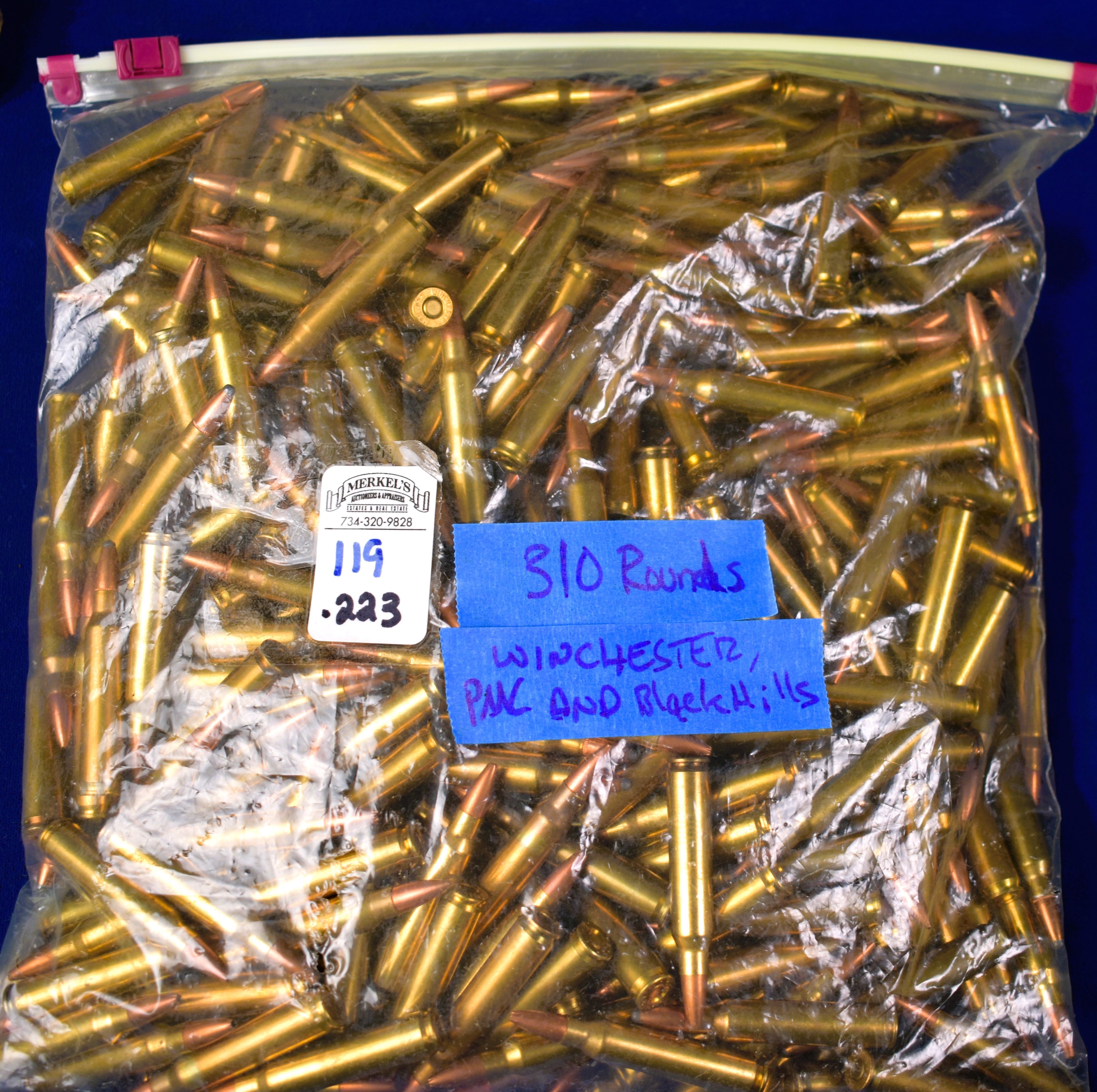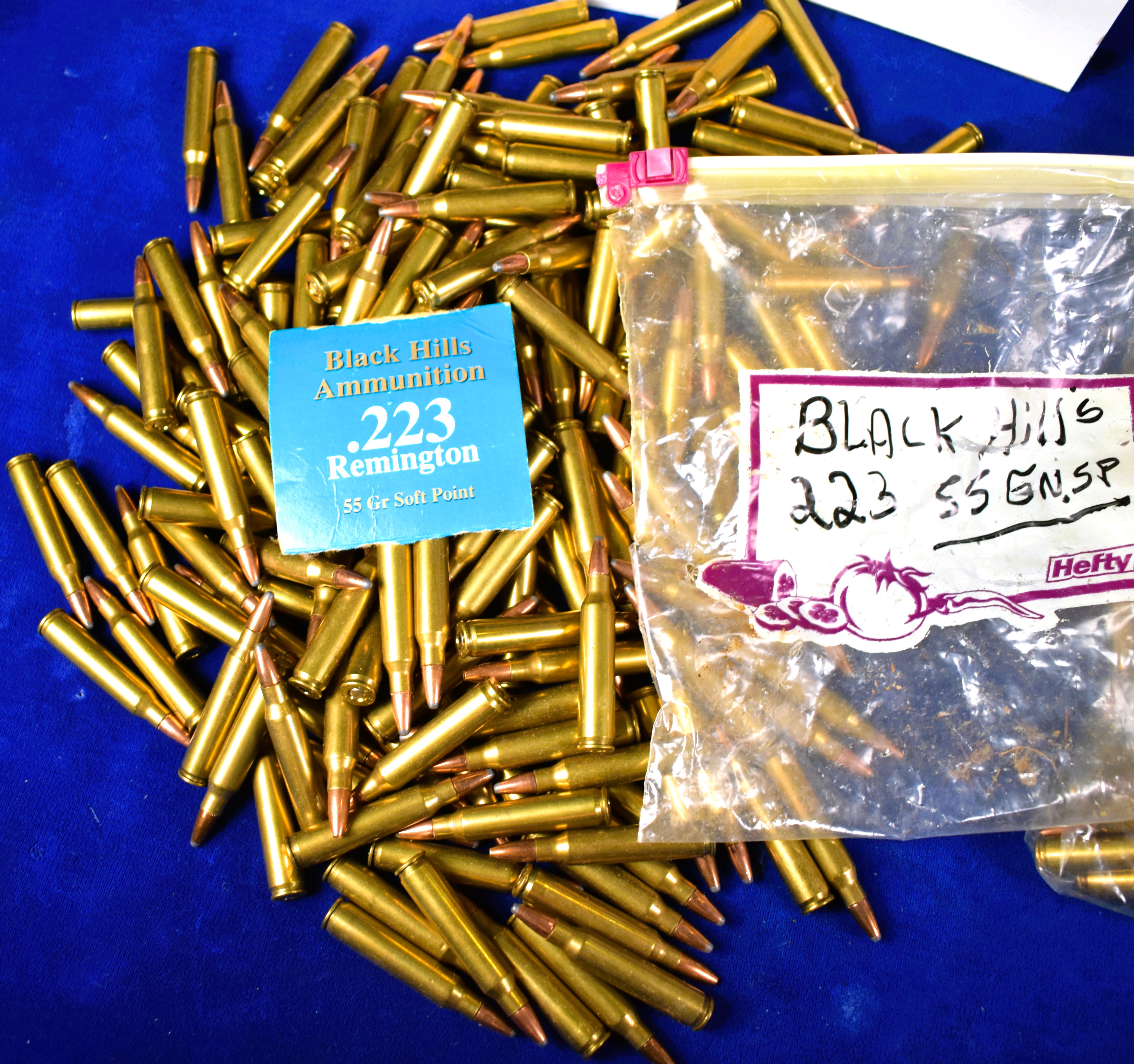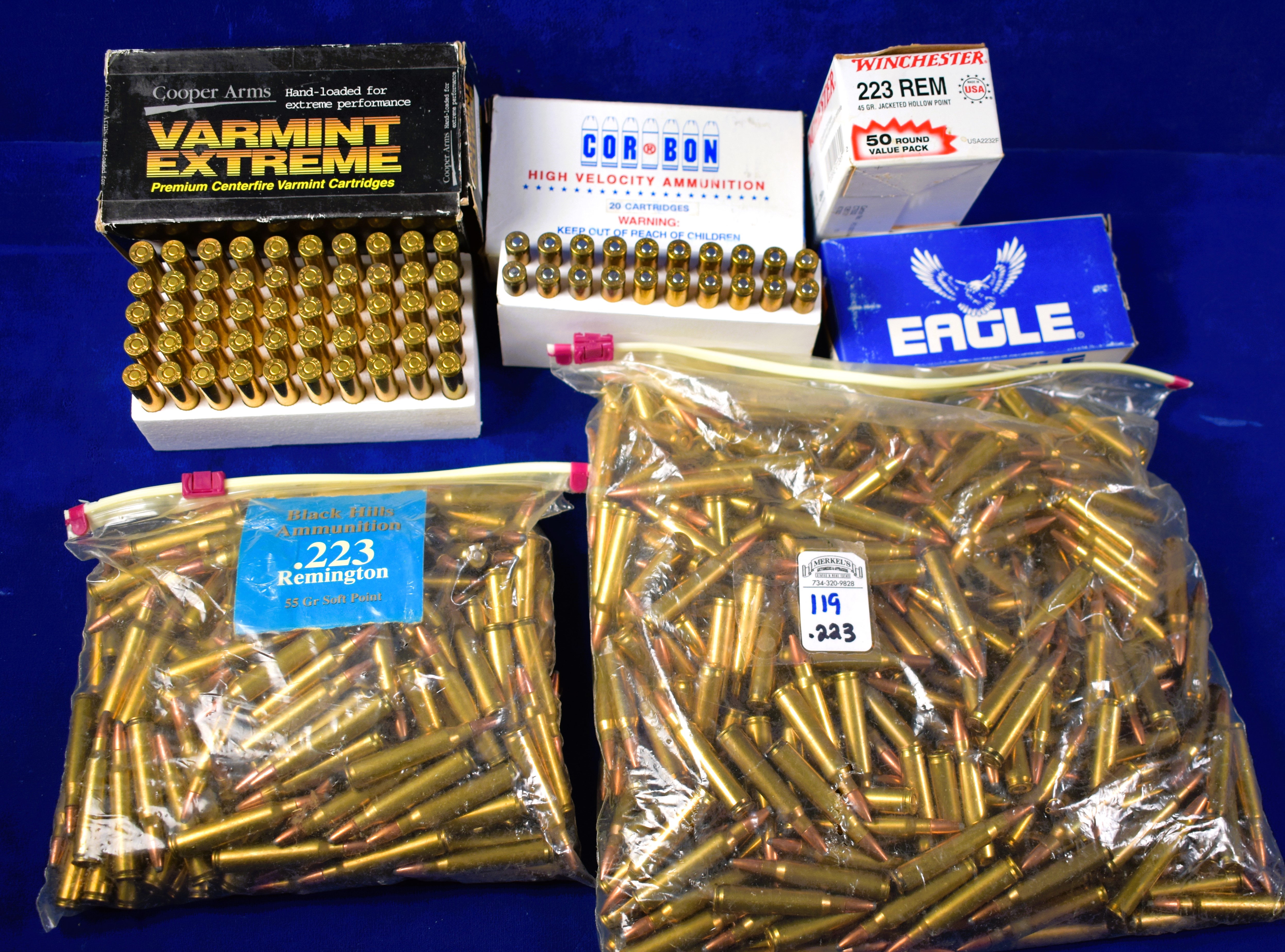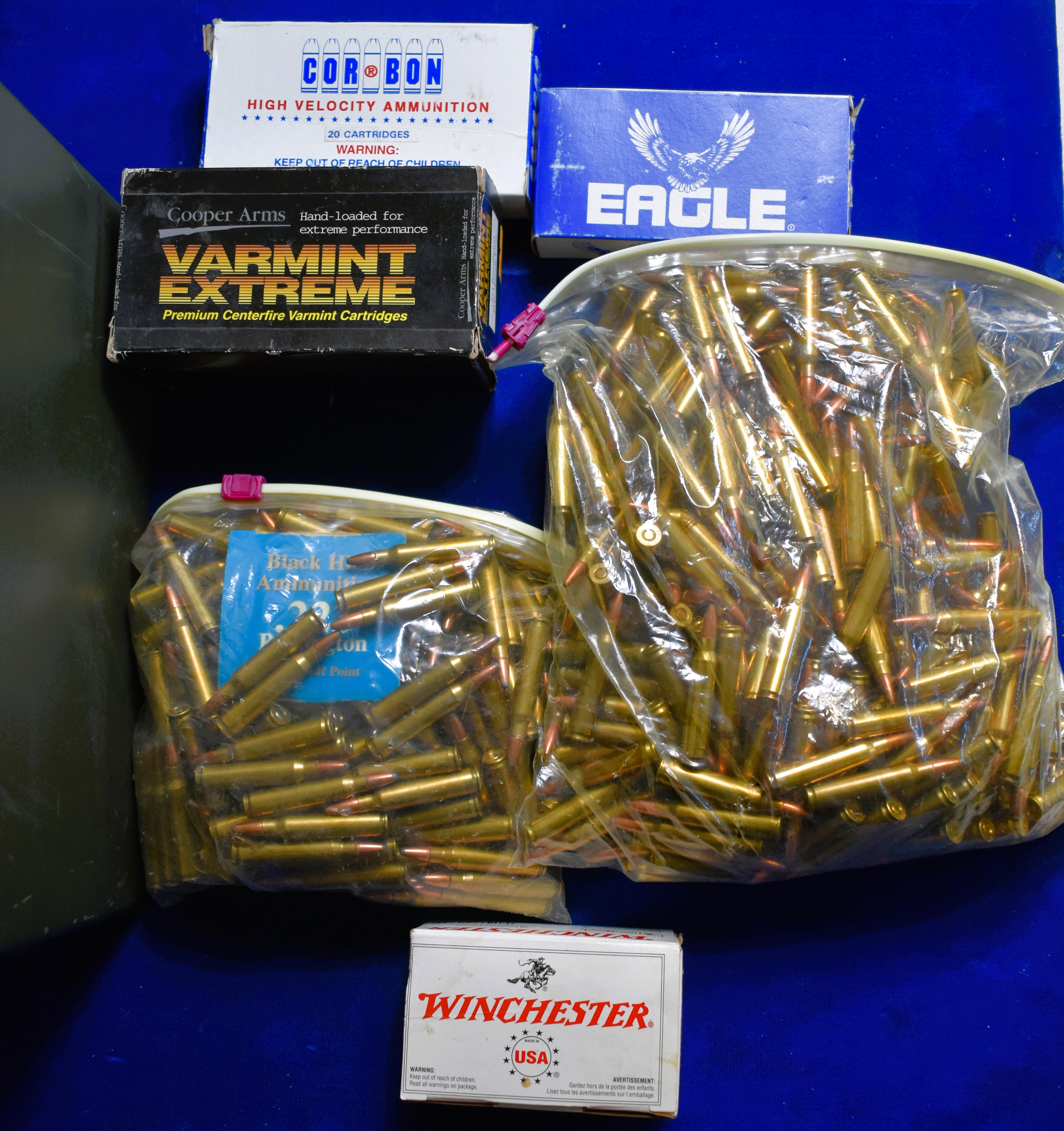 Lot includes (1)Bag of 310 Rounds Mixed Manufacturers include Winchester, PMC and Black Hills, (1)Bag of 175 Rounds by Black Hills, (1)Box of 50 Winchester, (1)Box of 20 Eagle Match Grade, (1)Box CorBon 20 Rounds Ballistic Tip(3200FPS), and (1)Box 50 Rounds Varmint Extreme 223 Remington 40gr. Hornady VMax. See pictures for more specifics. Shipping ONLY UPS GROUND due to regulations.