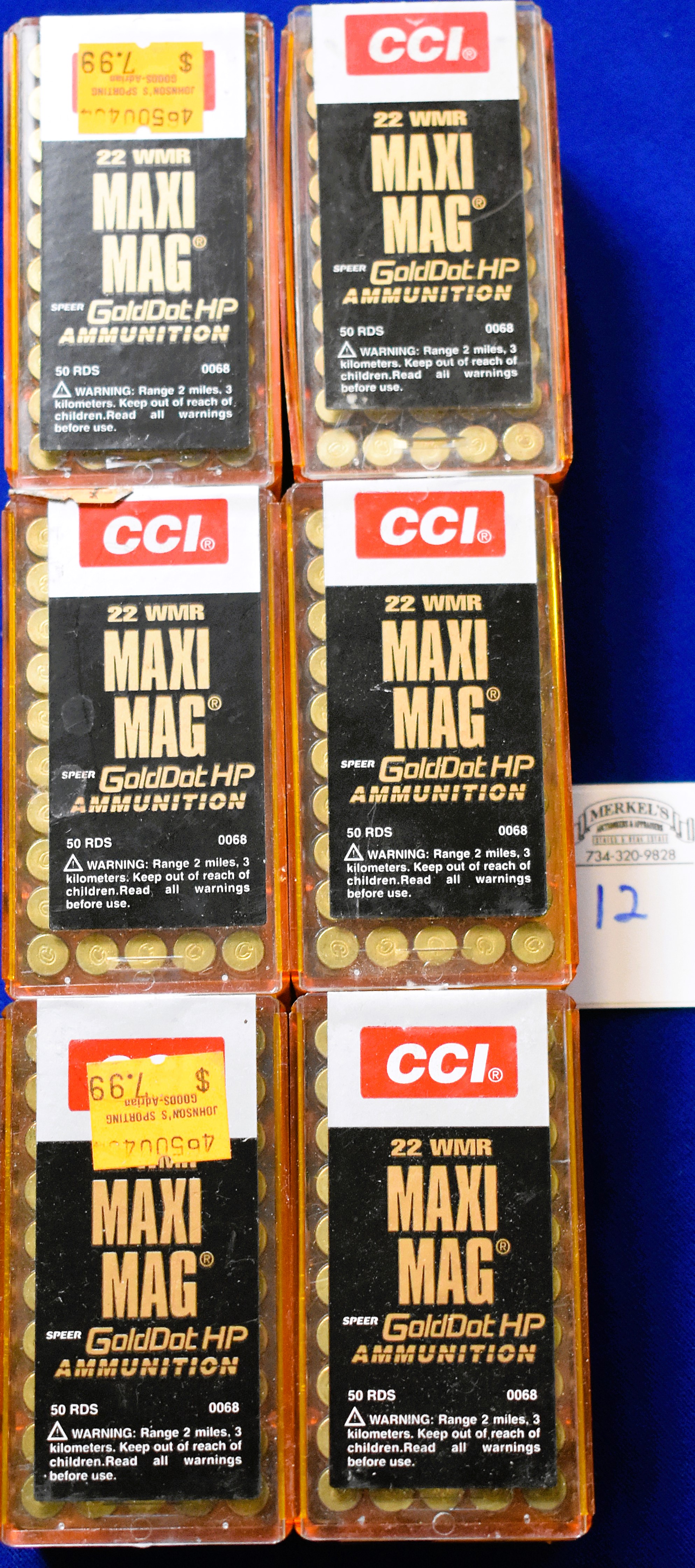 Factory New Old Stock- 300 Rounds (6 Boxes) CCI 22 WMR Maxi Mag Speer Gold Dot Hollow Point, Shipping ONLY UPS GROUND due to regulations.
