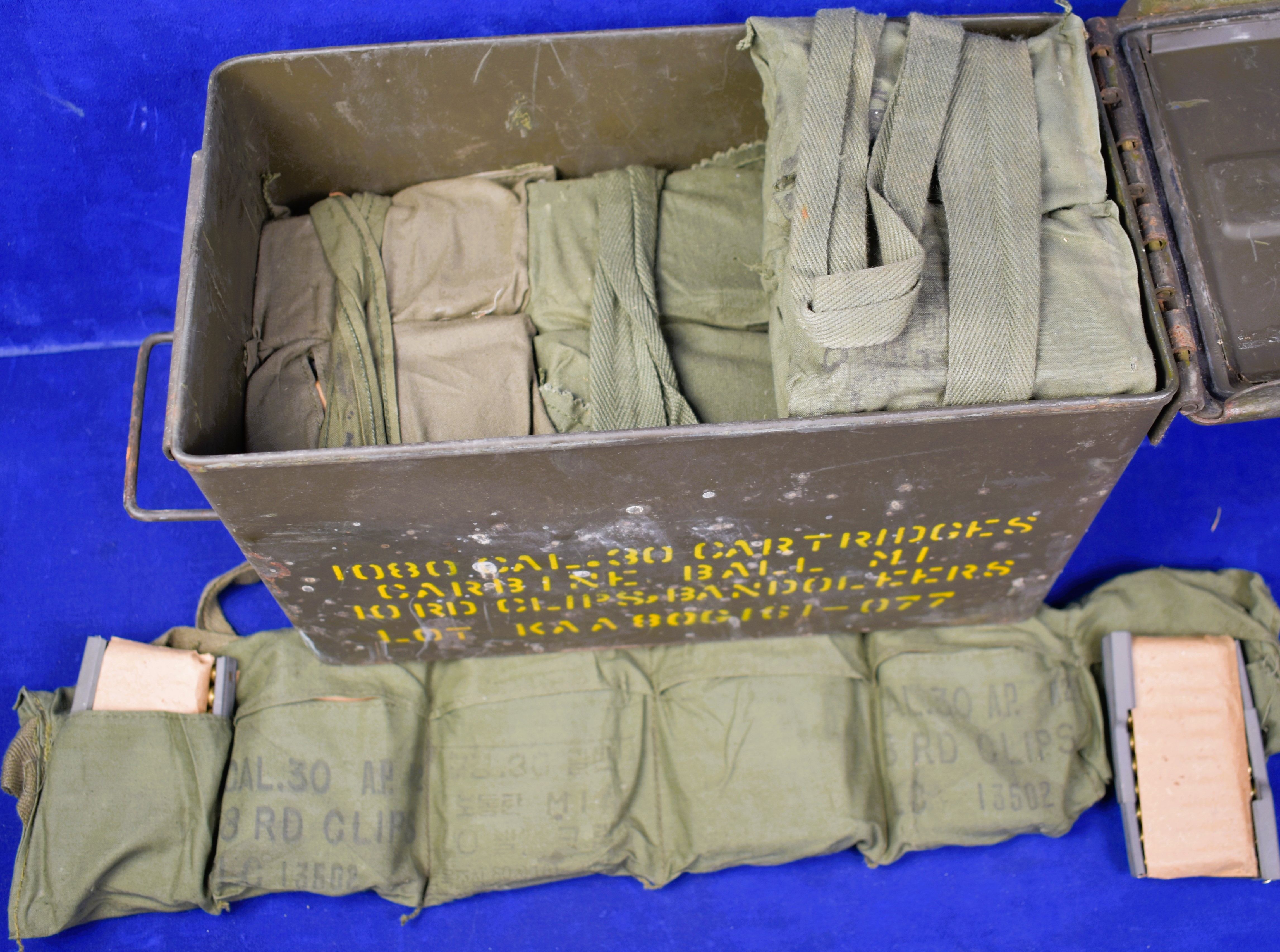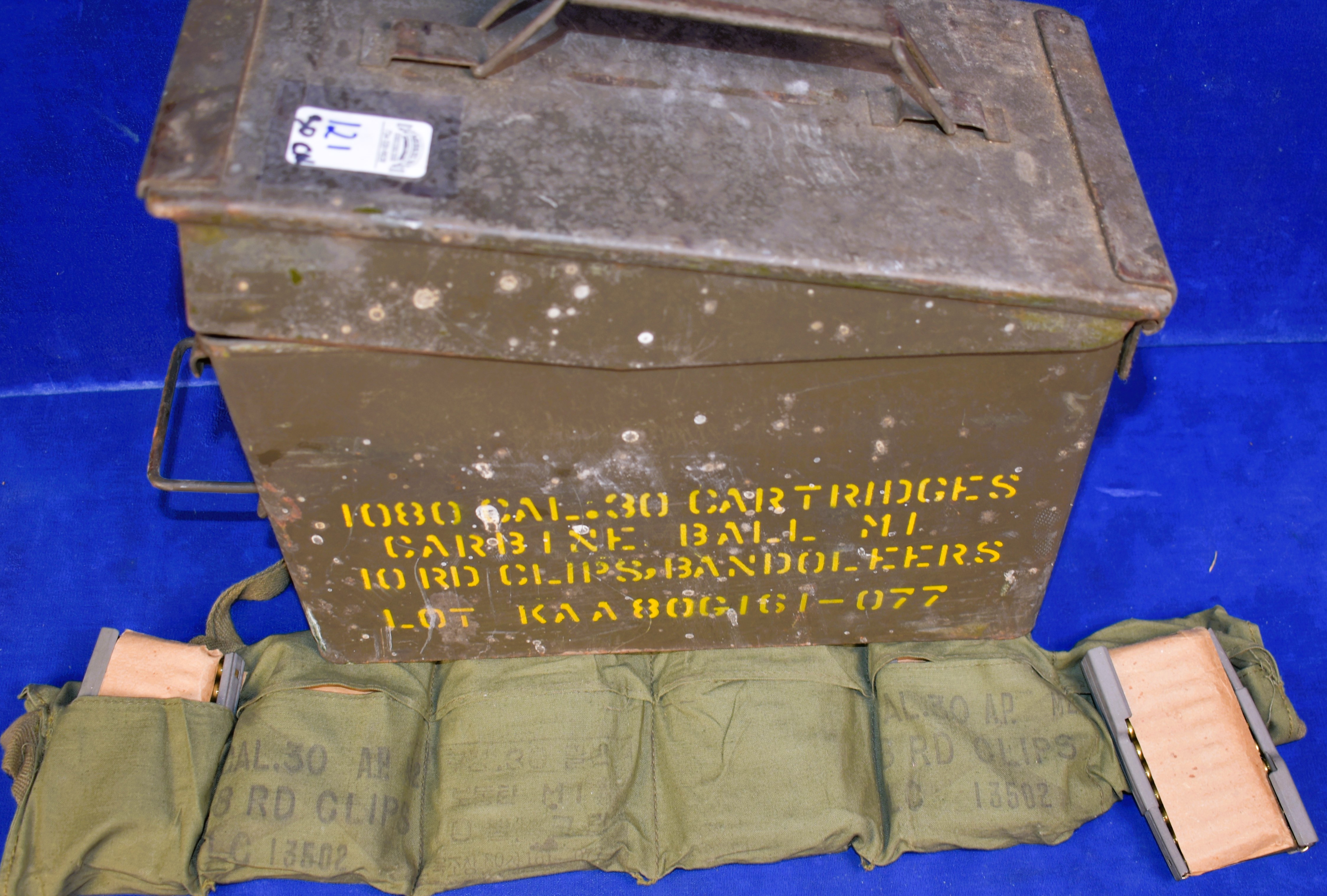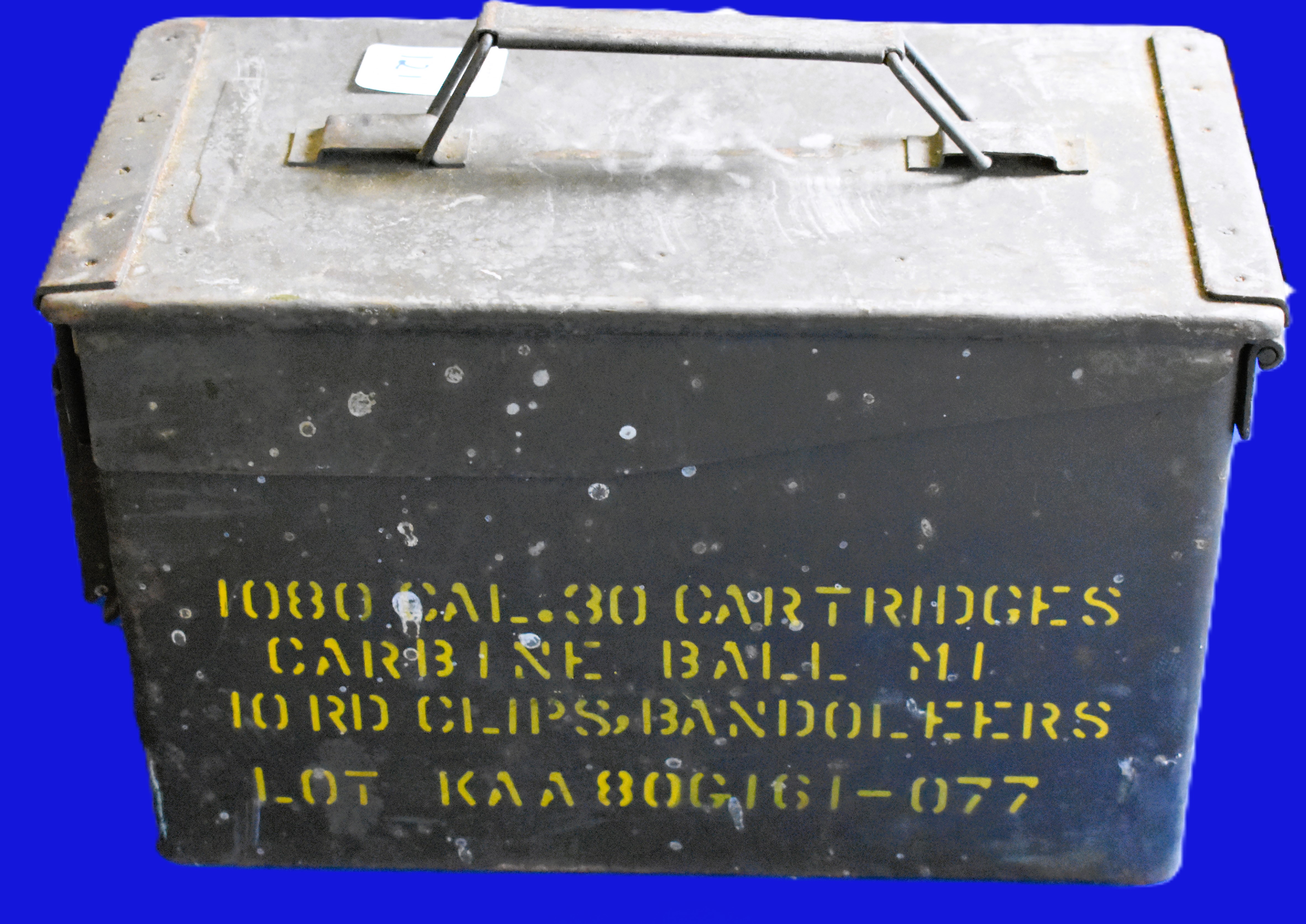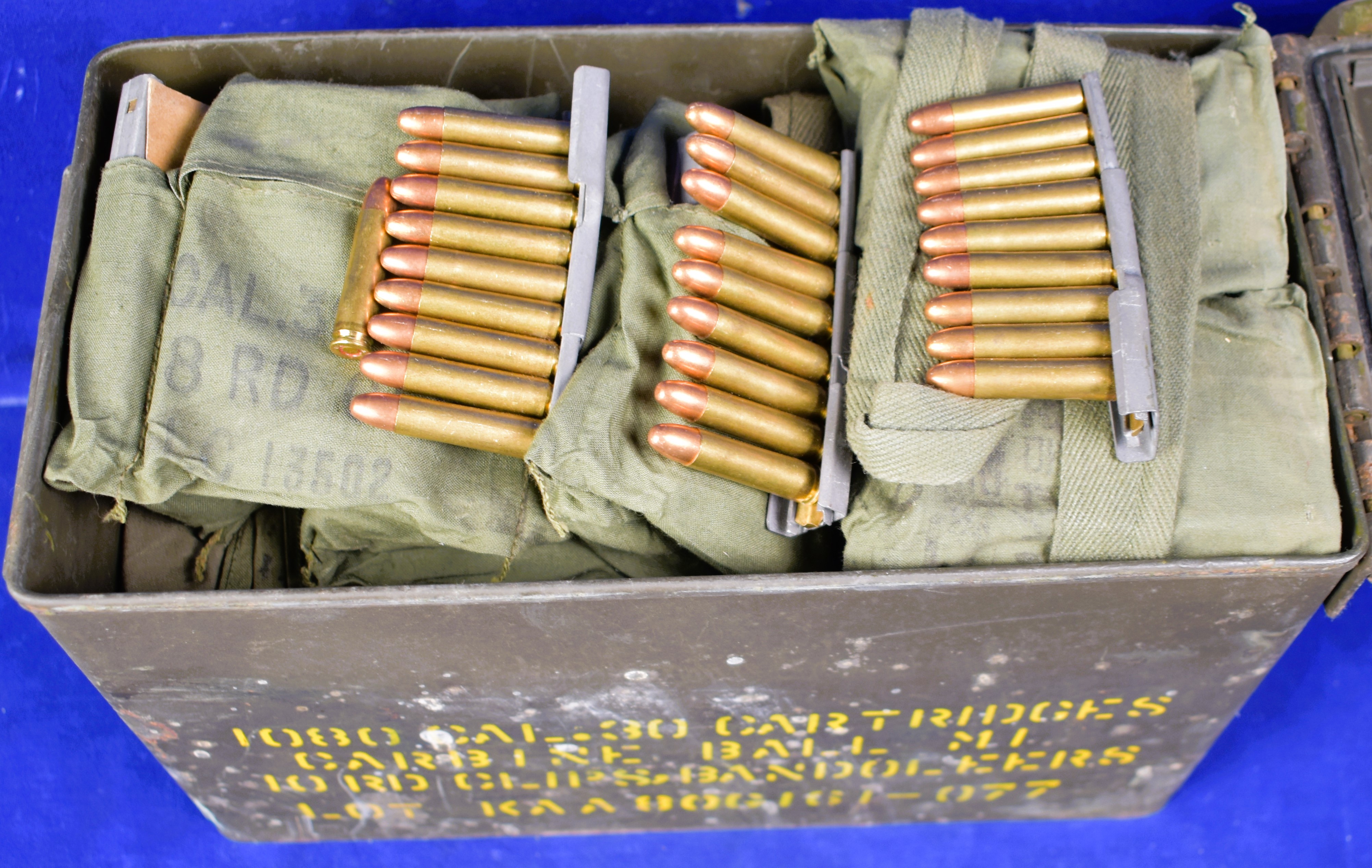 Factory New Old Stock – Metal Ammo Can Full of Military 30 caliber carbine Ball M1 8 round clips in bandoleers. Shipping ONLY UPS GROUND due to regulations.1000+ Rounds Total in Military Issue Can.