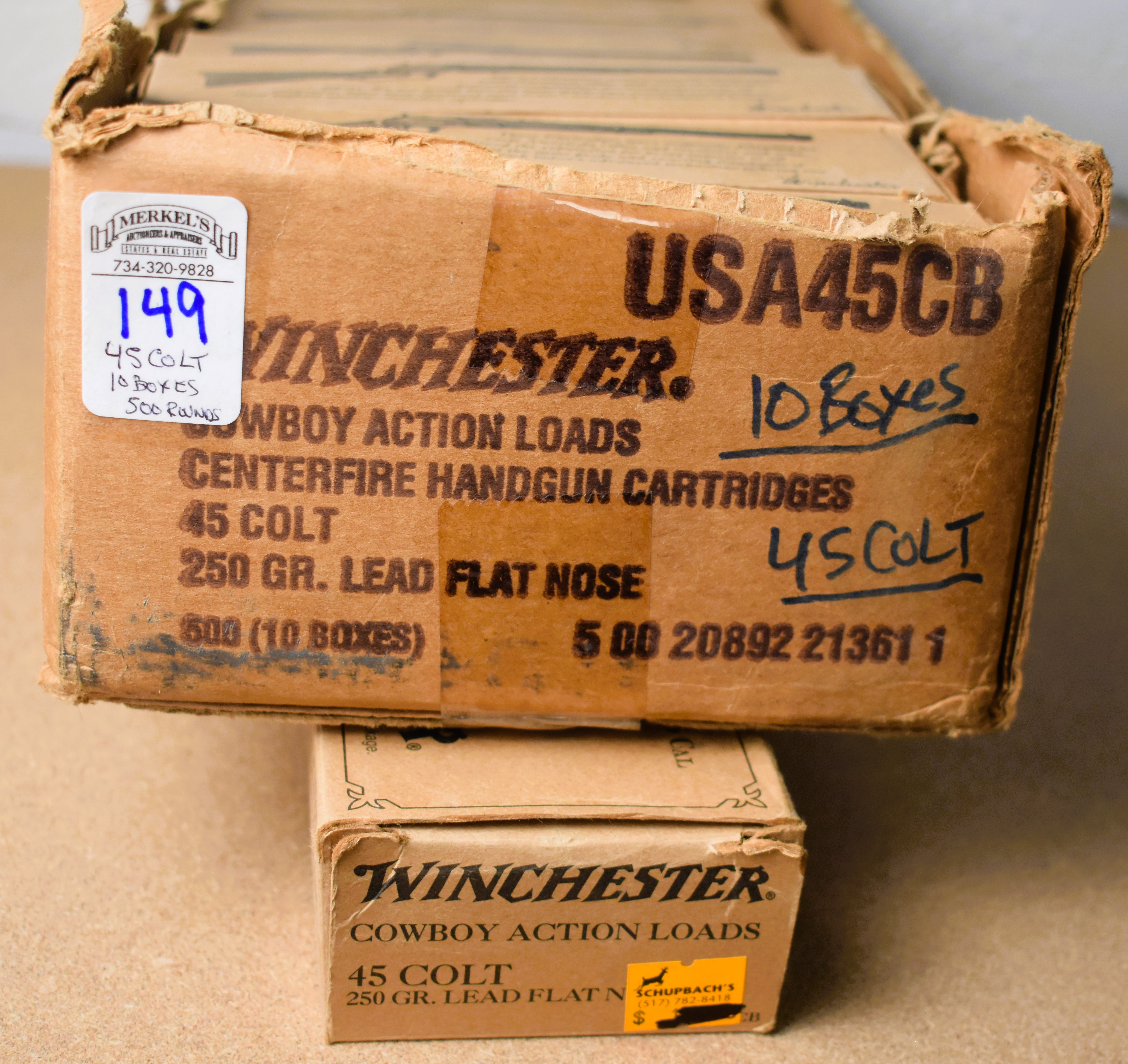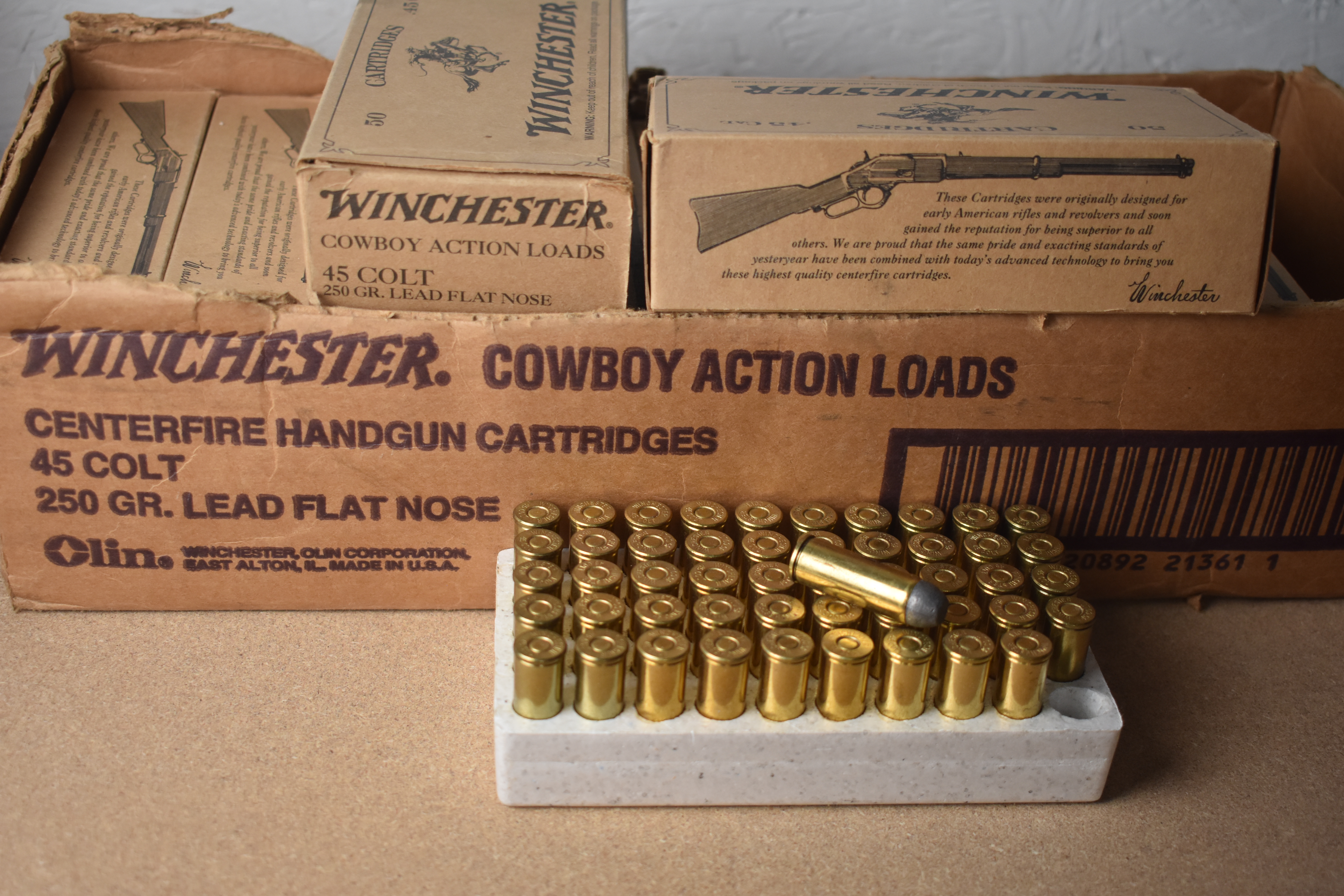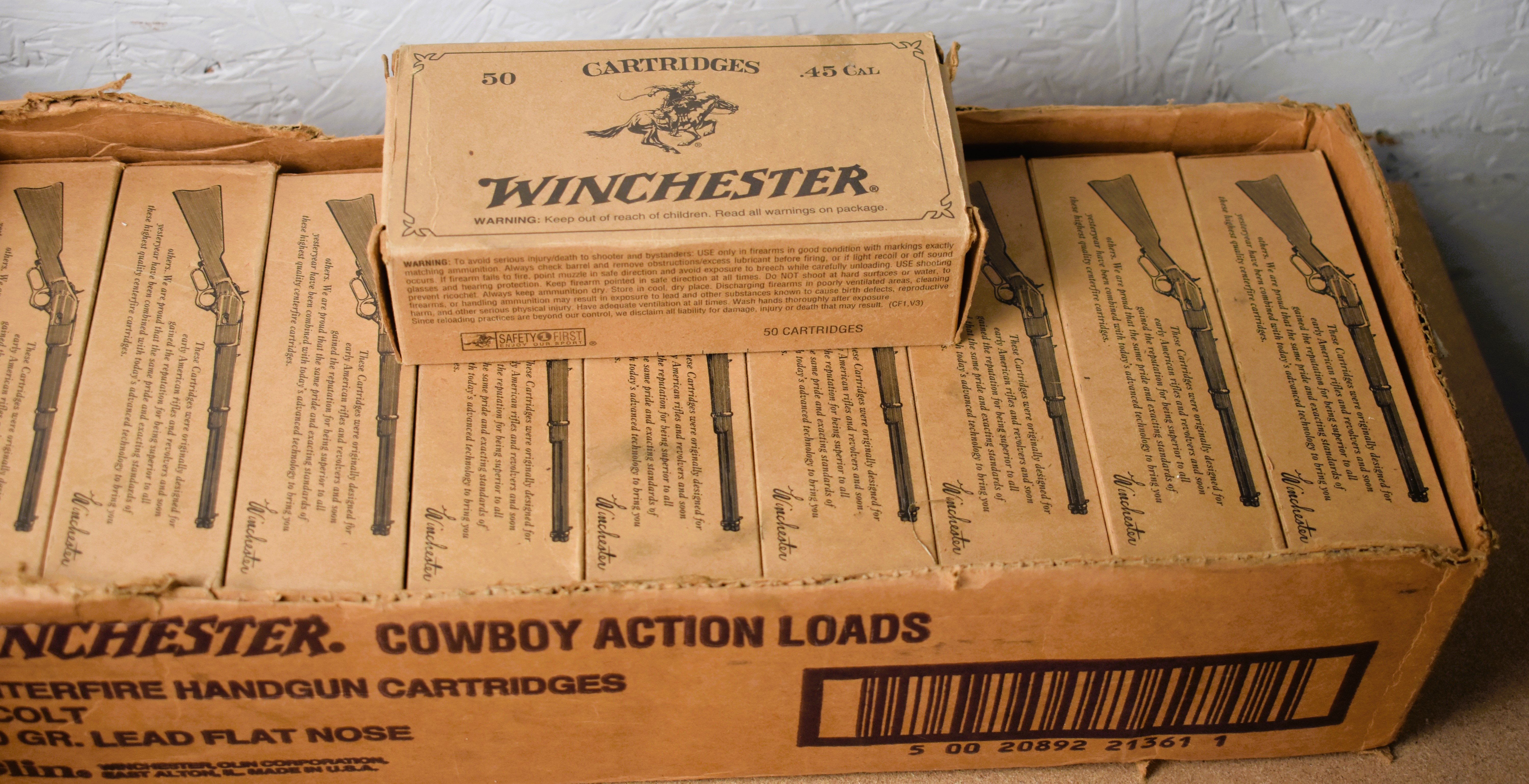 Factory New Old Stock – 500 Rounds (10 Boxes) Winchester 45 Colt – Cowboy Action Loads. 250 gr. Lead flat nose. In original shipping box minus the top. Shipping ONLY UPS GROUND due to regulations.