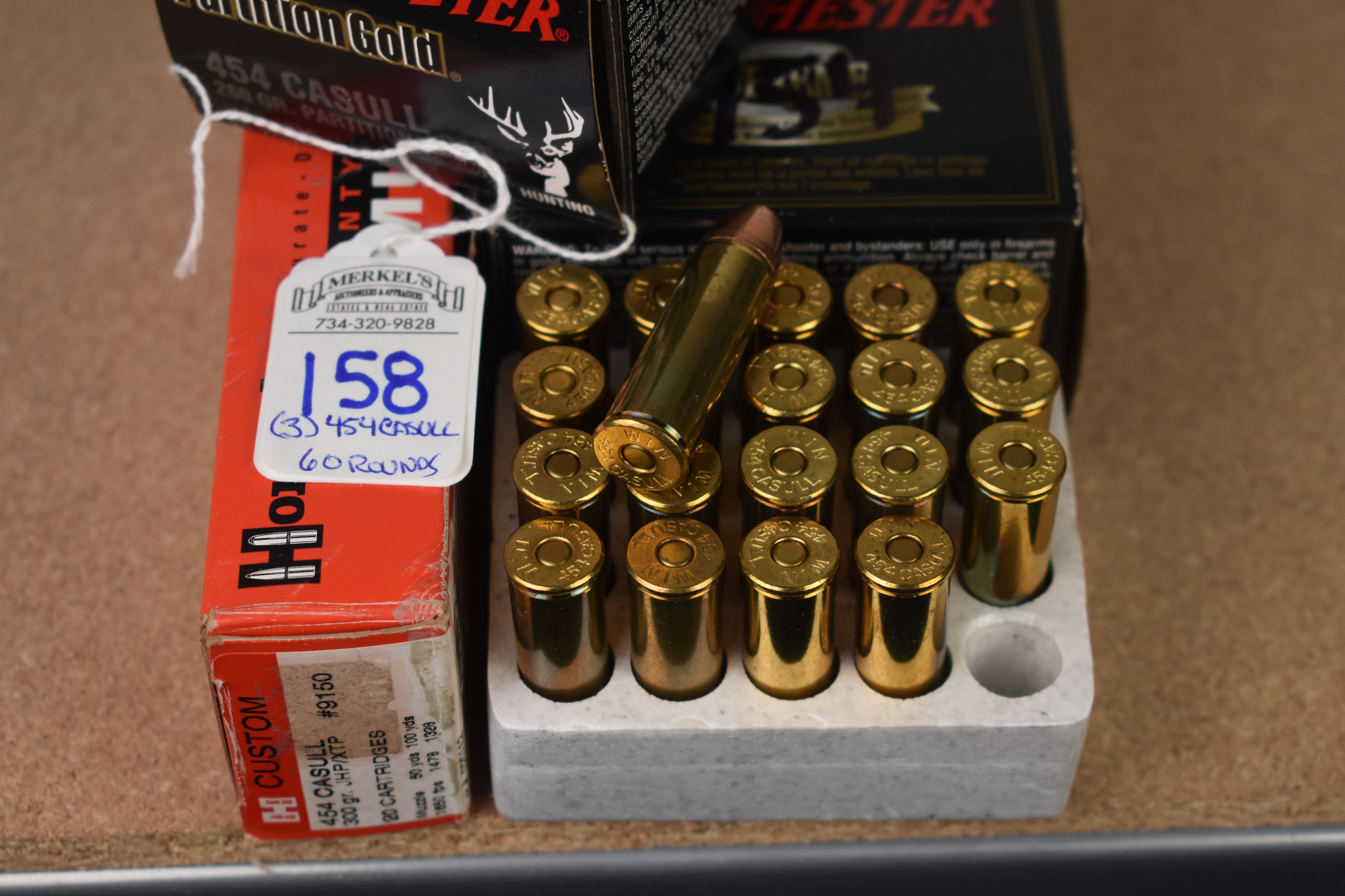 Factory New Old Stock – 60 Rounds (3 Boxes) 454 Casull as follows: 2 boxes – Winchester 454 Casull 260 gr. partition gold and Hornady 454 Casull, 300 gr. JHP/XTP. Shipping ONLY UPS GROUND due to regulations.