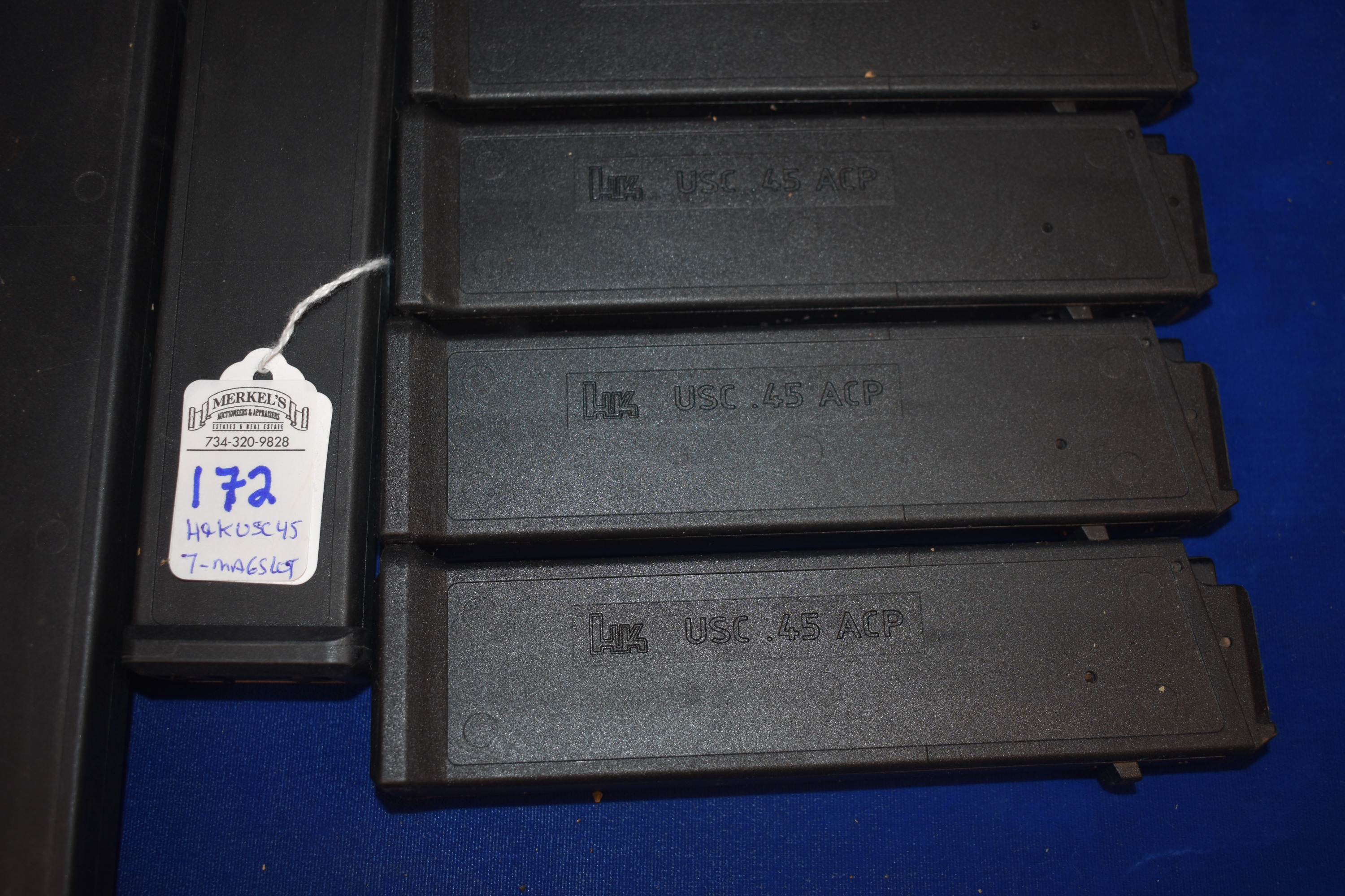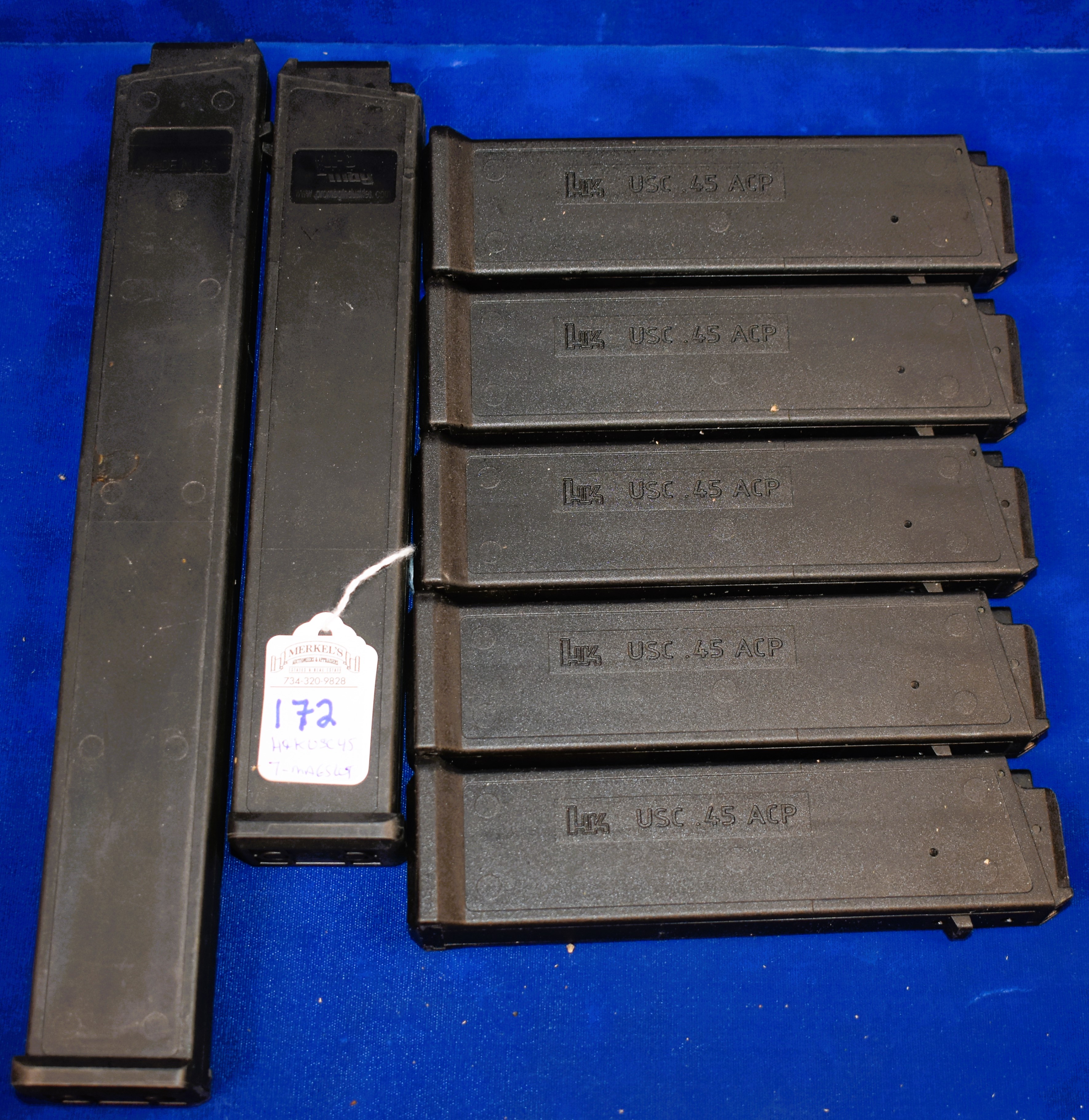 Factory New Old Stock – Lot of 7 H & K USC 45 Mags. 5 mags – 10 rounds, (marked H & K, 1 mag – 15 rounds, (marked Pro-Mag) and 1 mag – 20 rounds, (marked Pro-Mag).