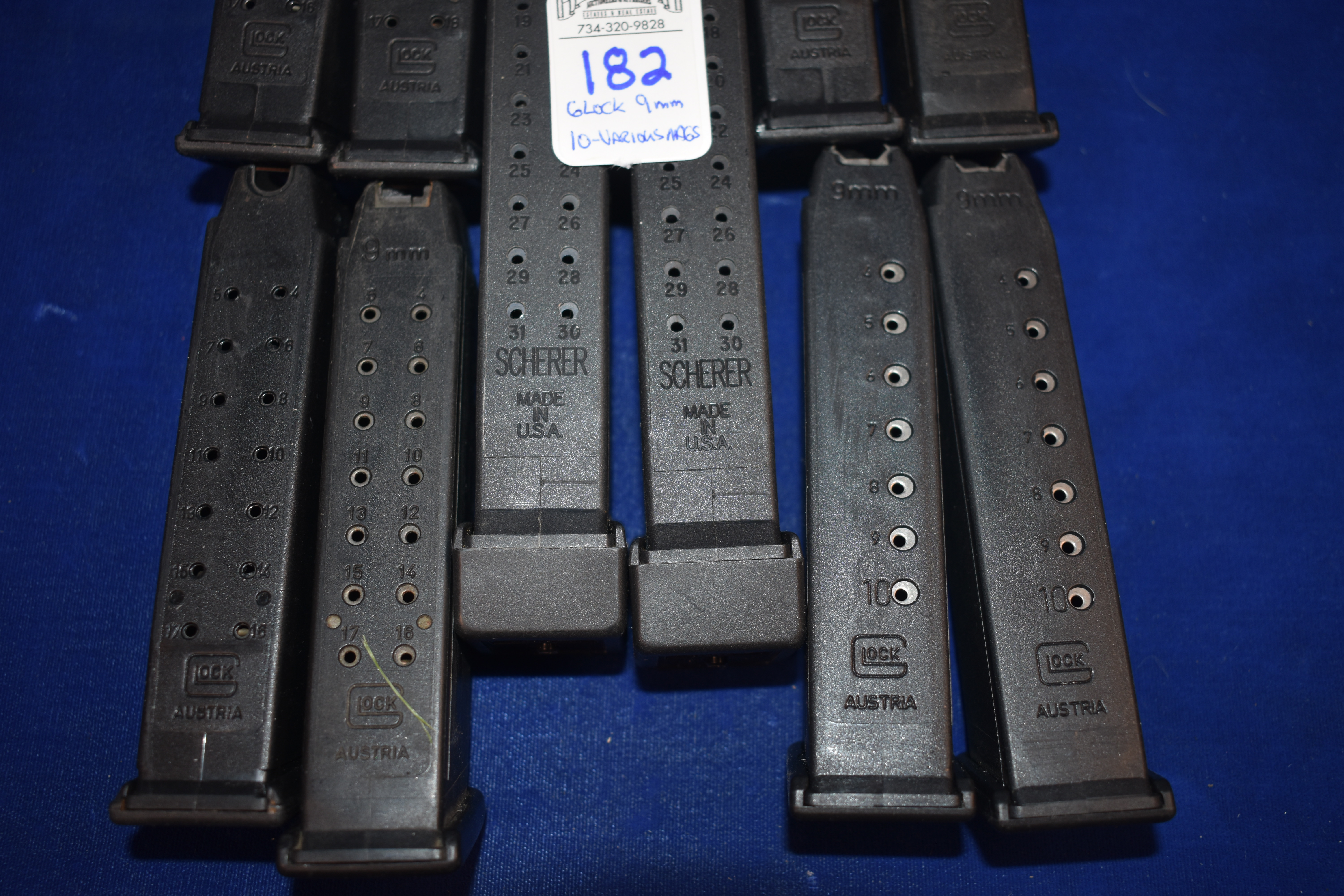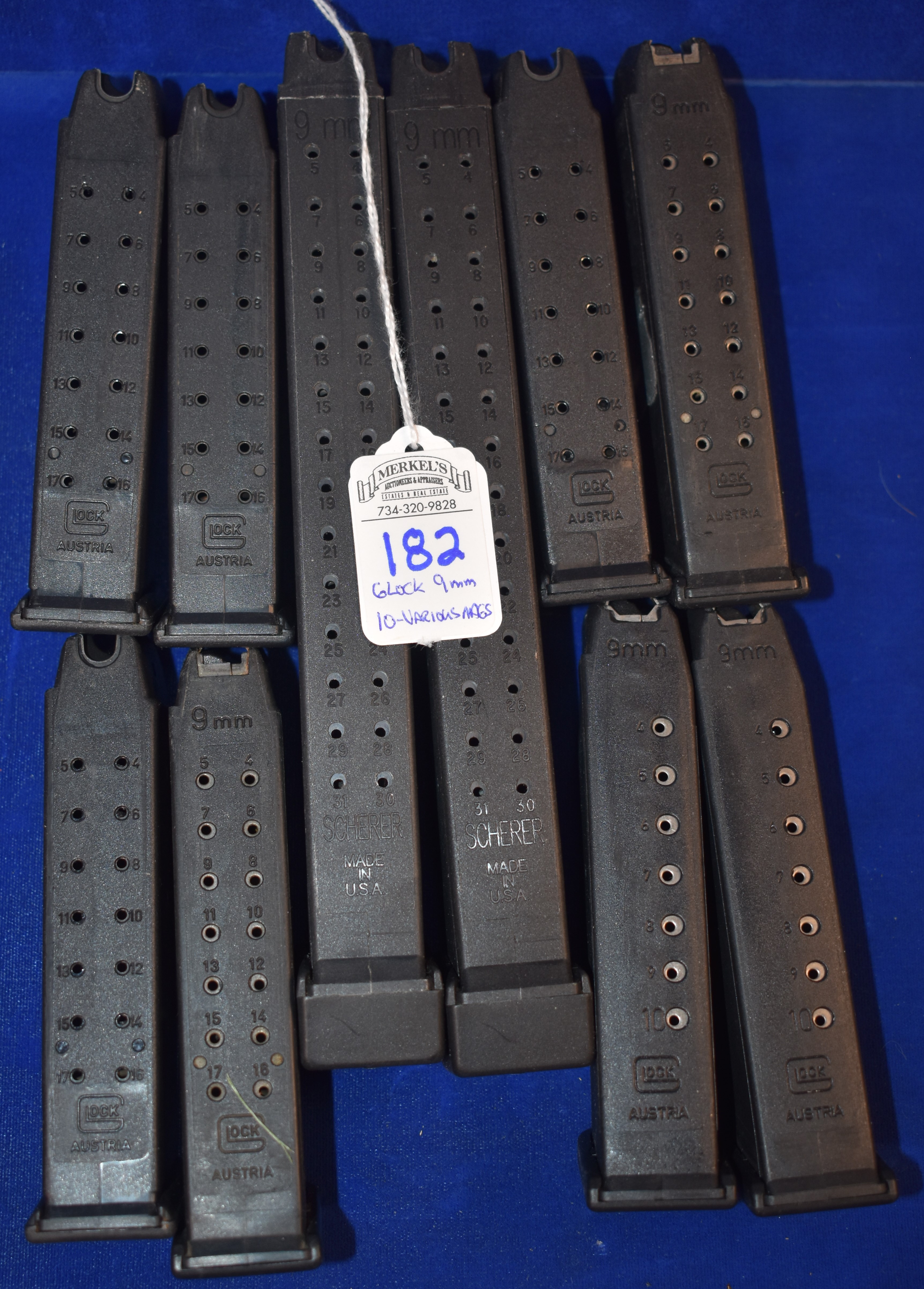 Factory New Old Stock – Lot of 10 Various Glock 9 MM Mags. 2 – 31 Round – Scherer, 2 – 10 Round – Glock and 6 – 17 Round Glock.