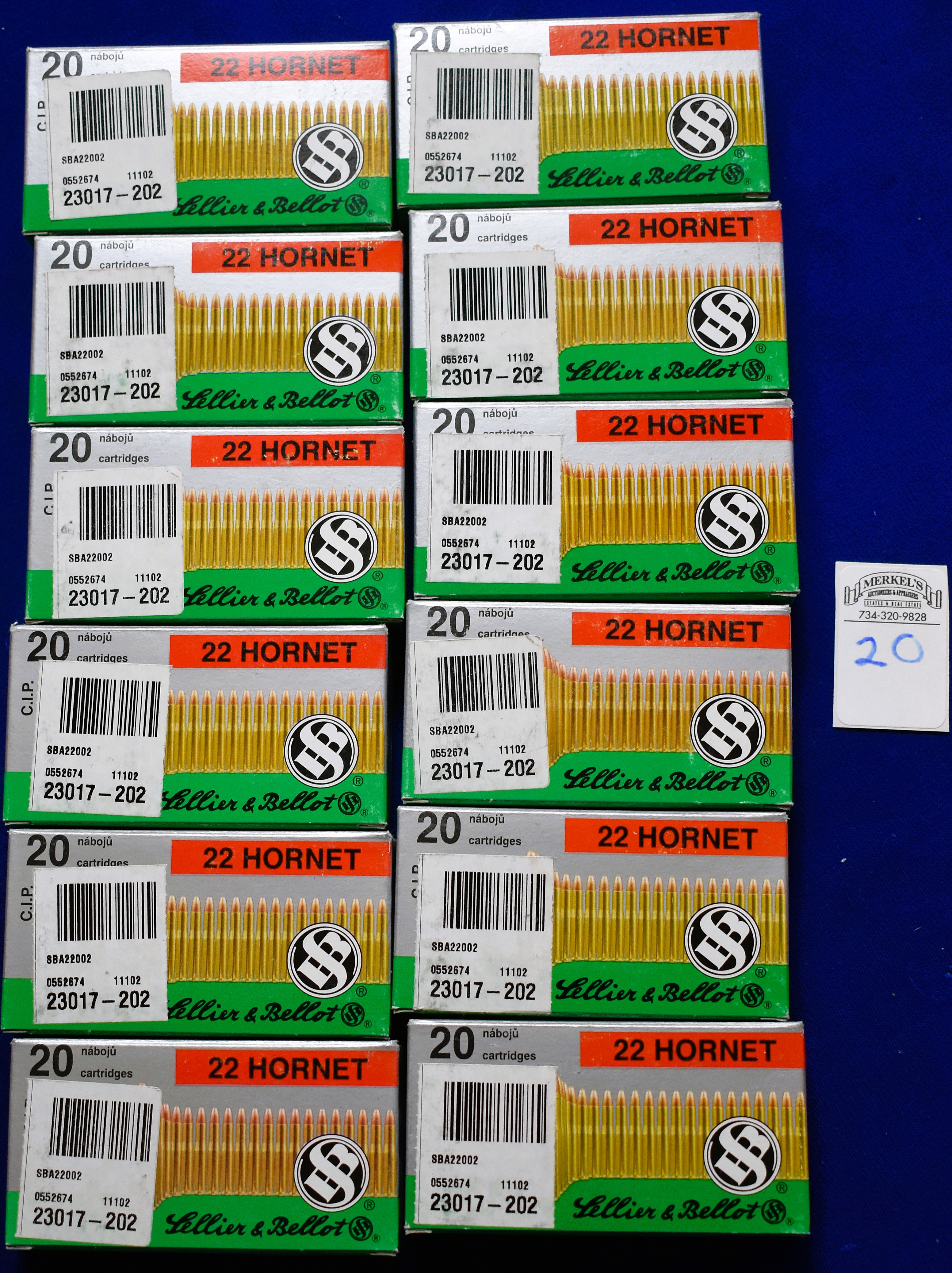 Factory New Old Stock- 240 Rounds (12 Boxes) Sellier & Bellot 22 Hornet 45 gr, Shipping ONLY UPS GROUND due to regulations.