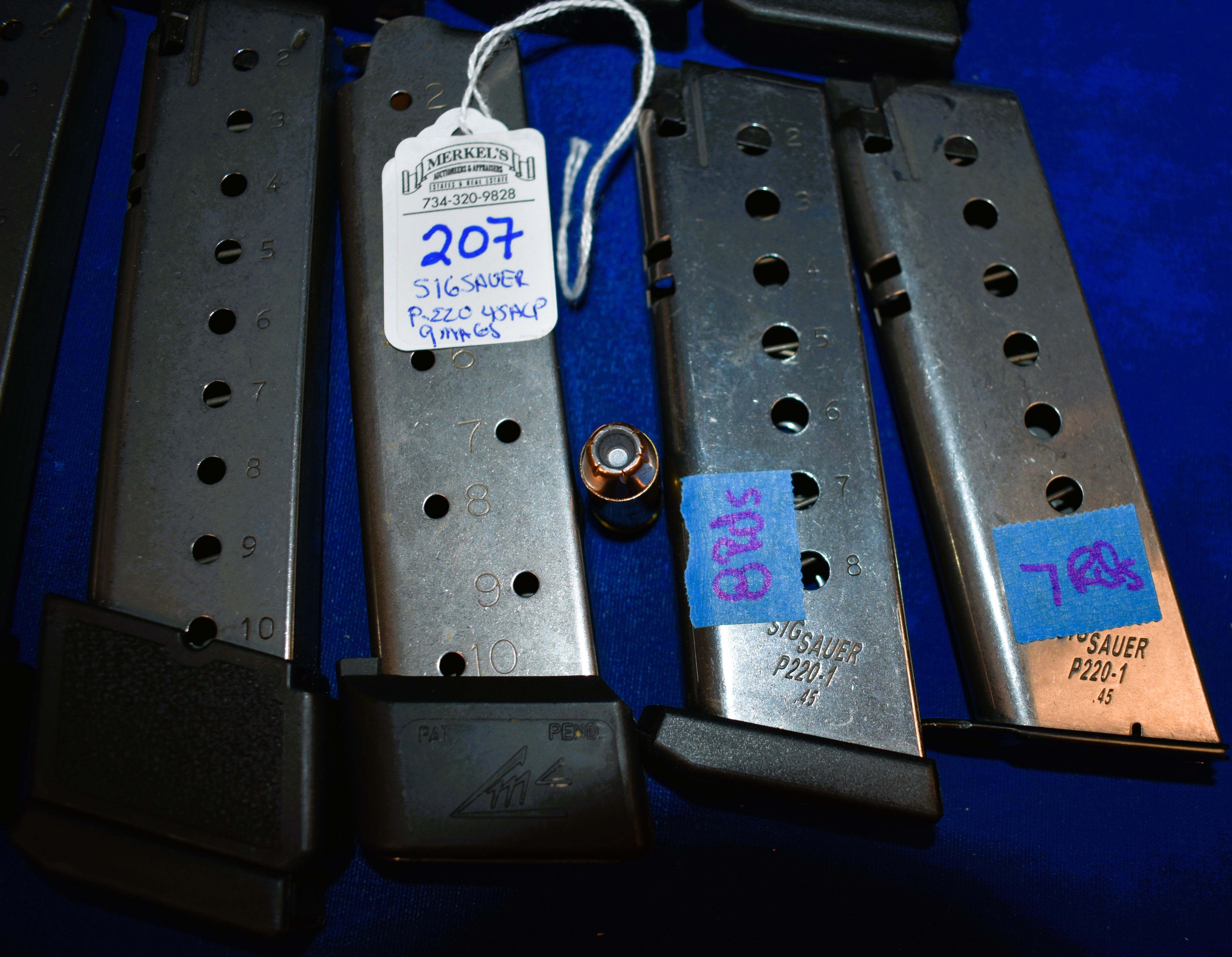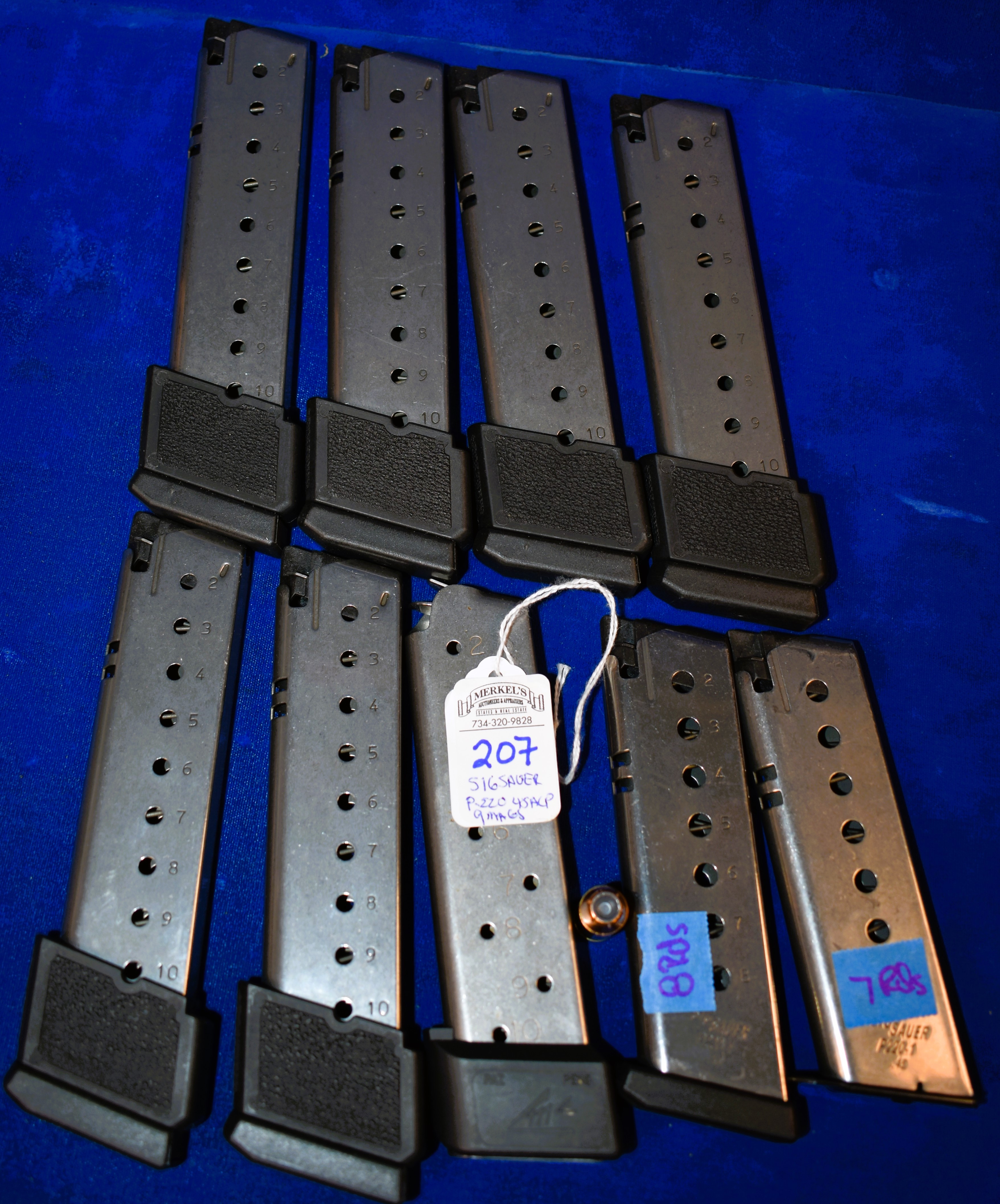 Factory New Old Stock -Lot of 9 – Sig Sauer 45 ACP Full Size Mags. All Mags are Stainless Steel. 7 Mags – 10 Rounds, 1 Mag – 8 Rounds and 1 Mag – 7 Rounds.