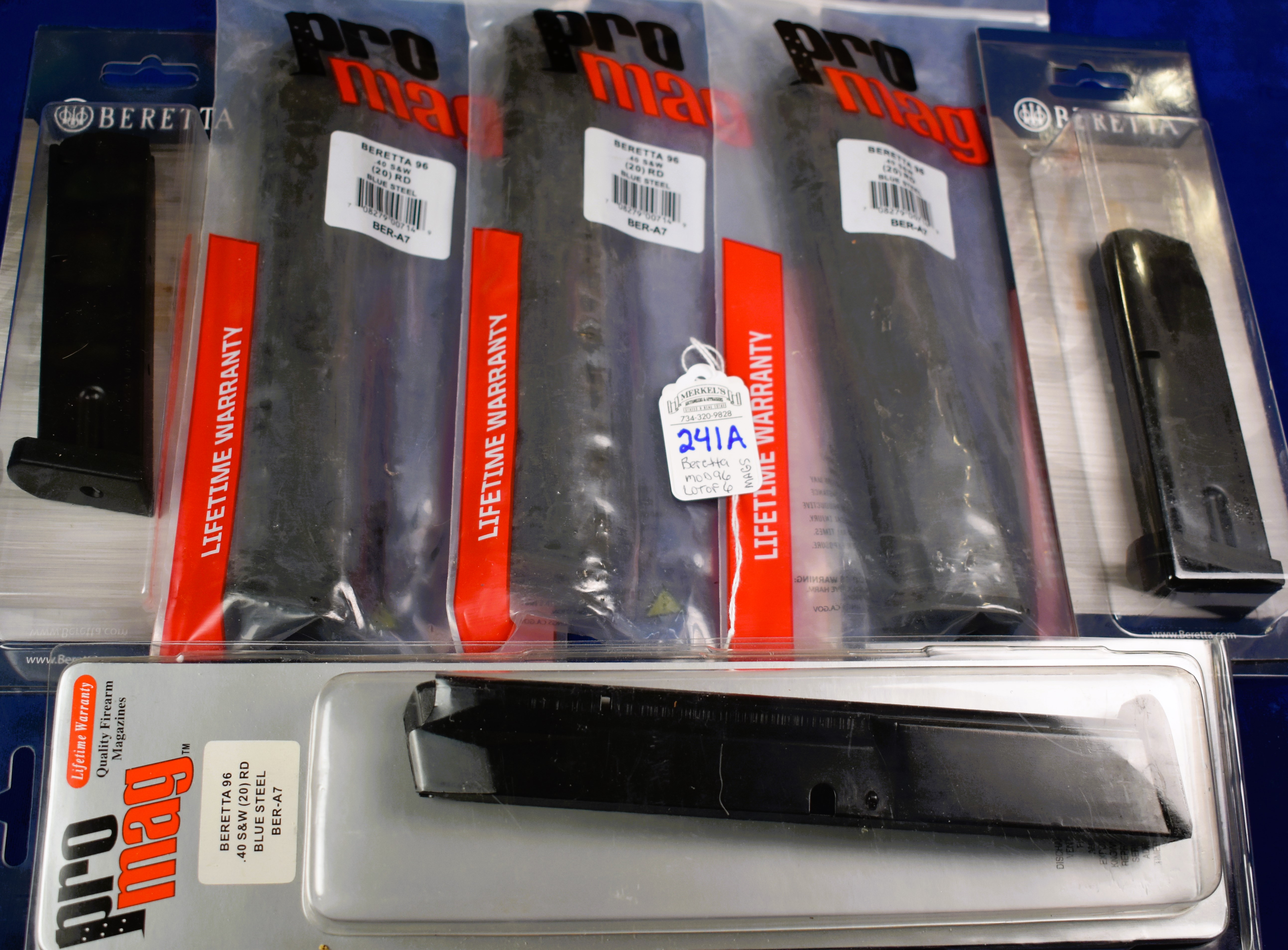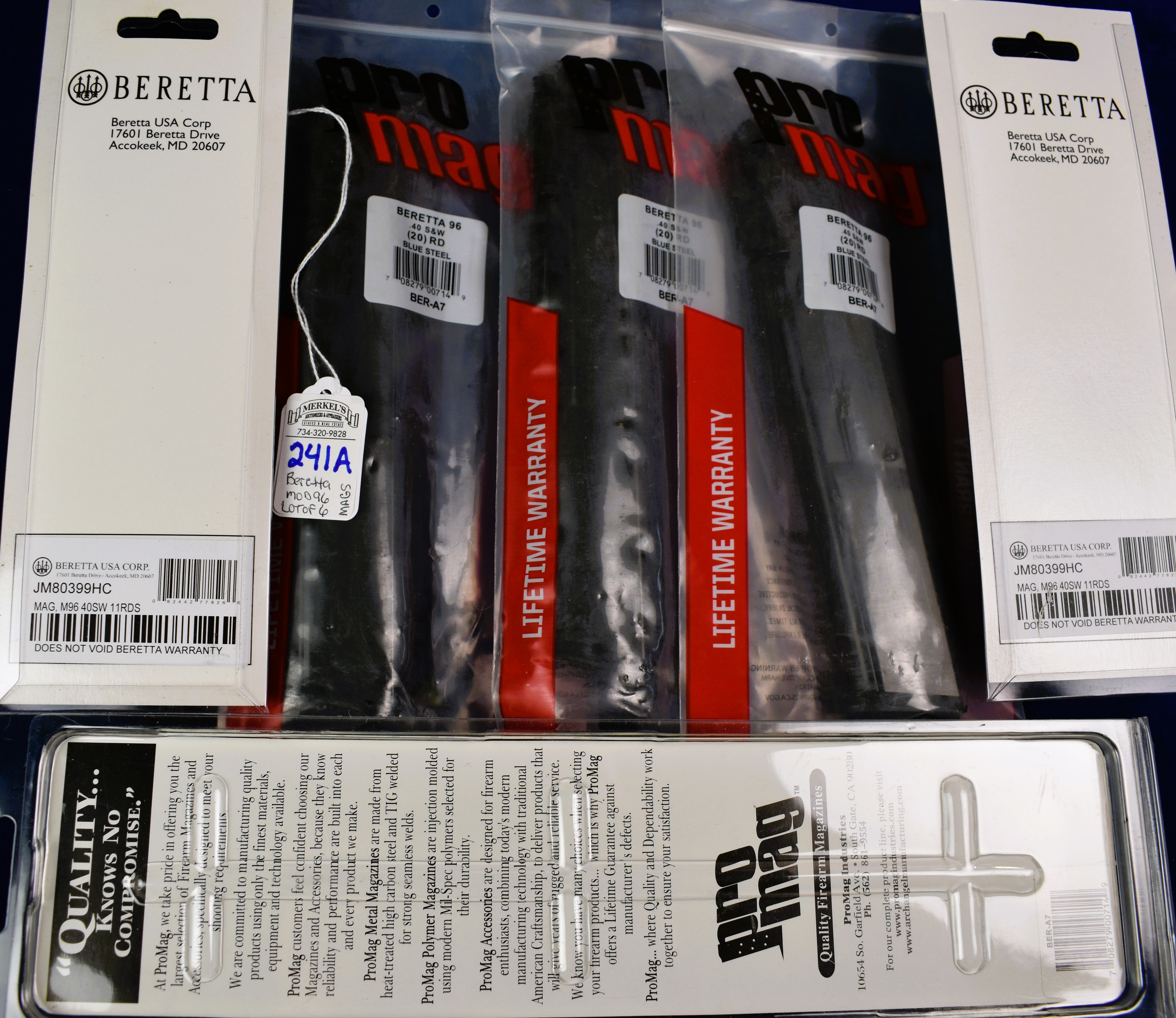 This Lot of 6- 40 S&W Magazines in original Factory/Distributor packaging. These New Old Stock Magazines are the same caliber as Lot 241 and fit The Beretta Model 96 chambered in 40 S&W. This lot has (2)Beretta M96 (11)Round Mags and (4)ProMag M96 (20)Round Mags.
