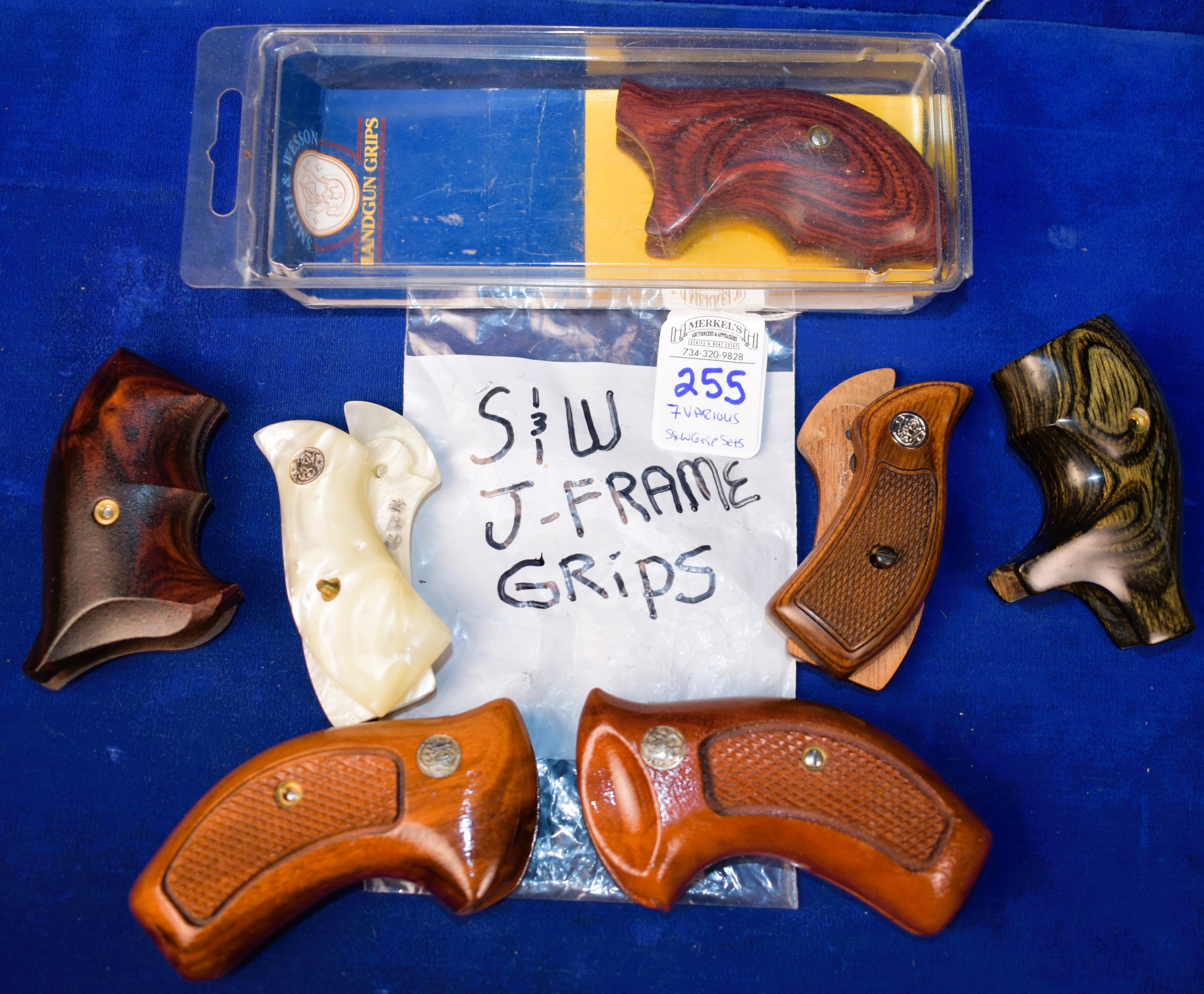 Lot of 7 Various Smith & Wesson J Frame style grip sets. This lot includes J-Combat Rosewood set in S&W Packaging, AJAX #22 IM Pearl, and others.See photos as evidence of condition.