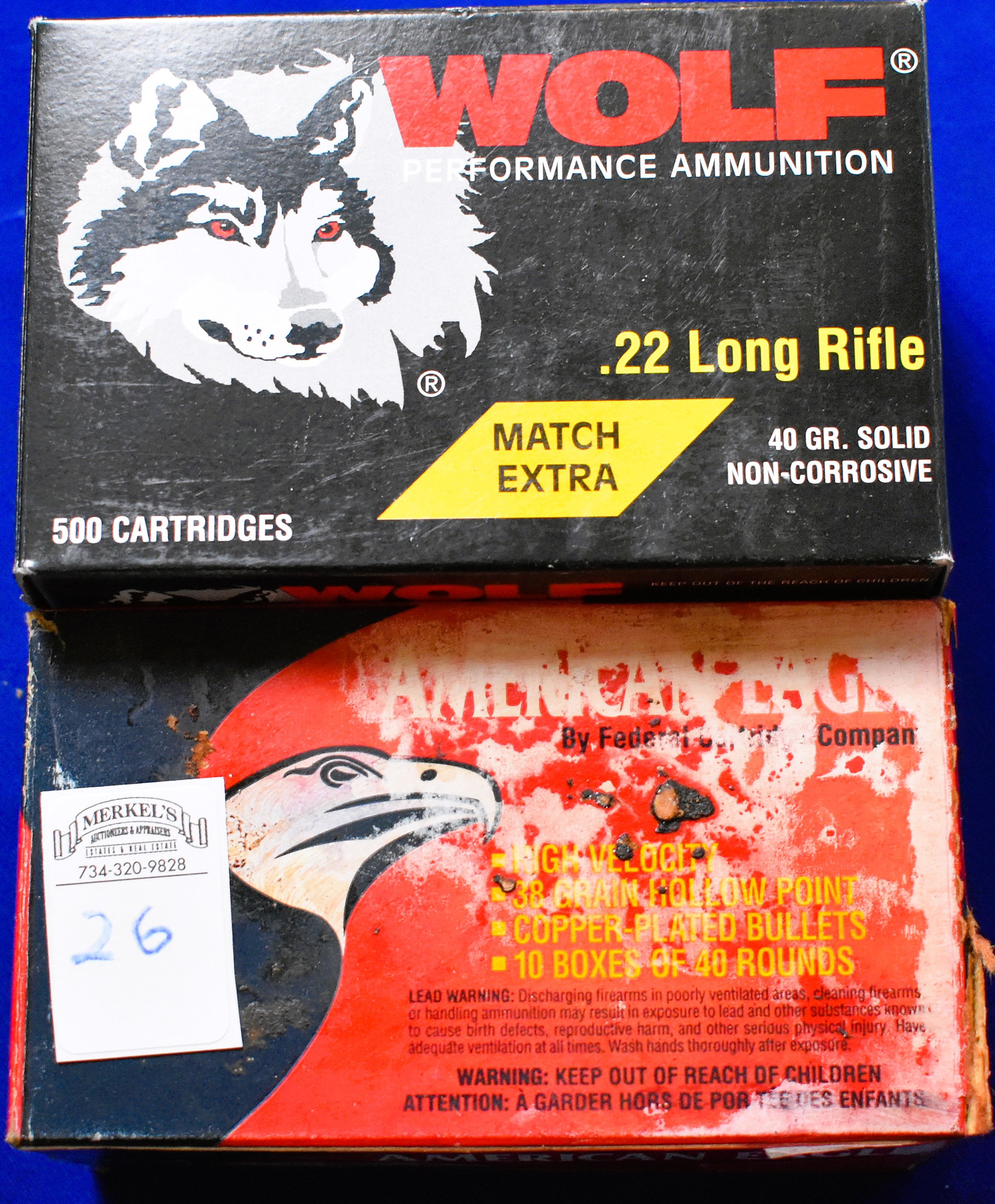 Factory New Old Stock- 900 Rounds (2 Boxes) Box 1 – American Eagle 400 Rounds of 22 LR Copper Plated High velocity 38 gr and Box 2 – Wolf 500 Rounds of 22 LR 40 gr. Shipping ONLY UPS GROUND due to regulations.