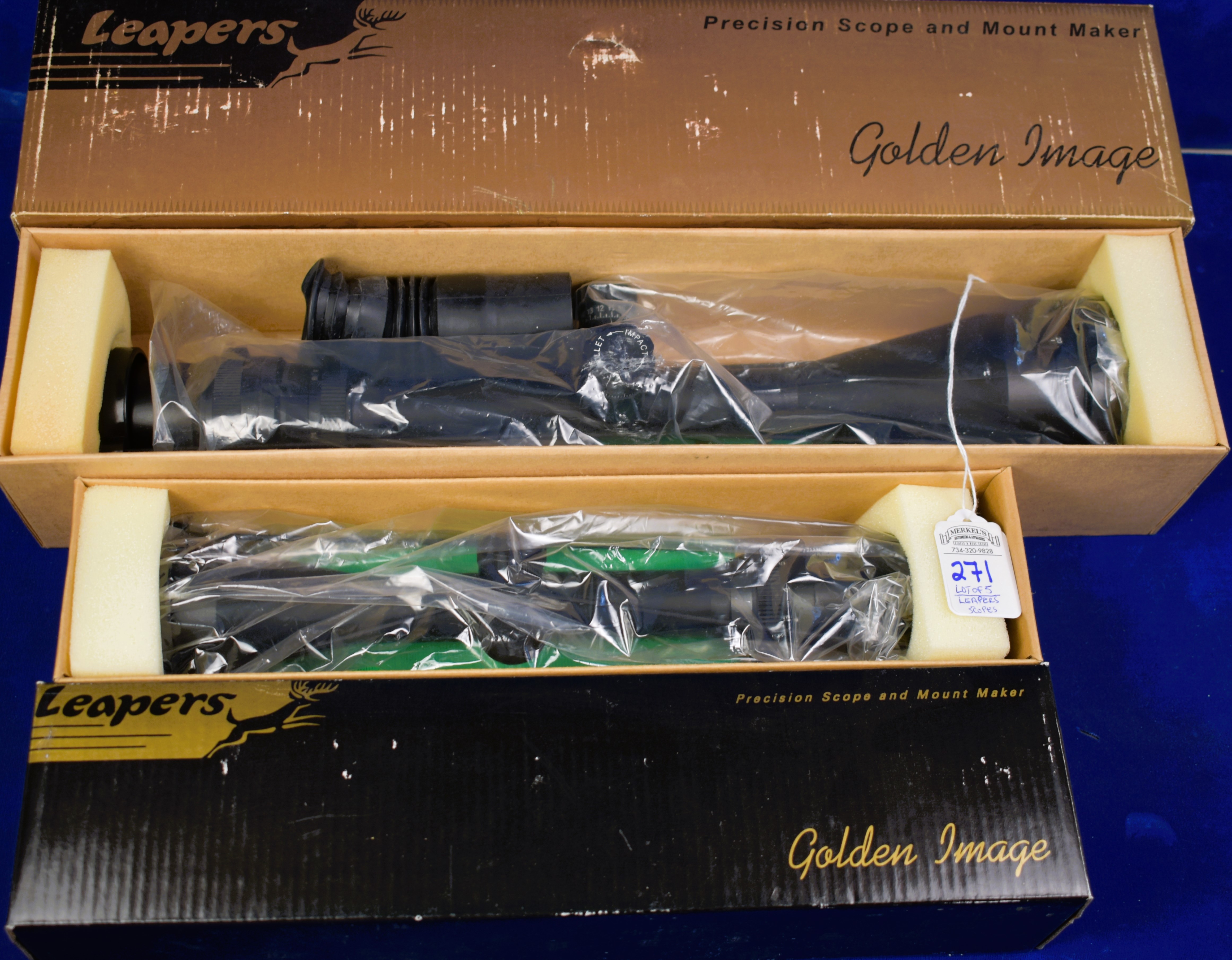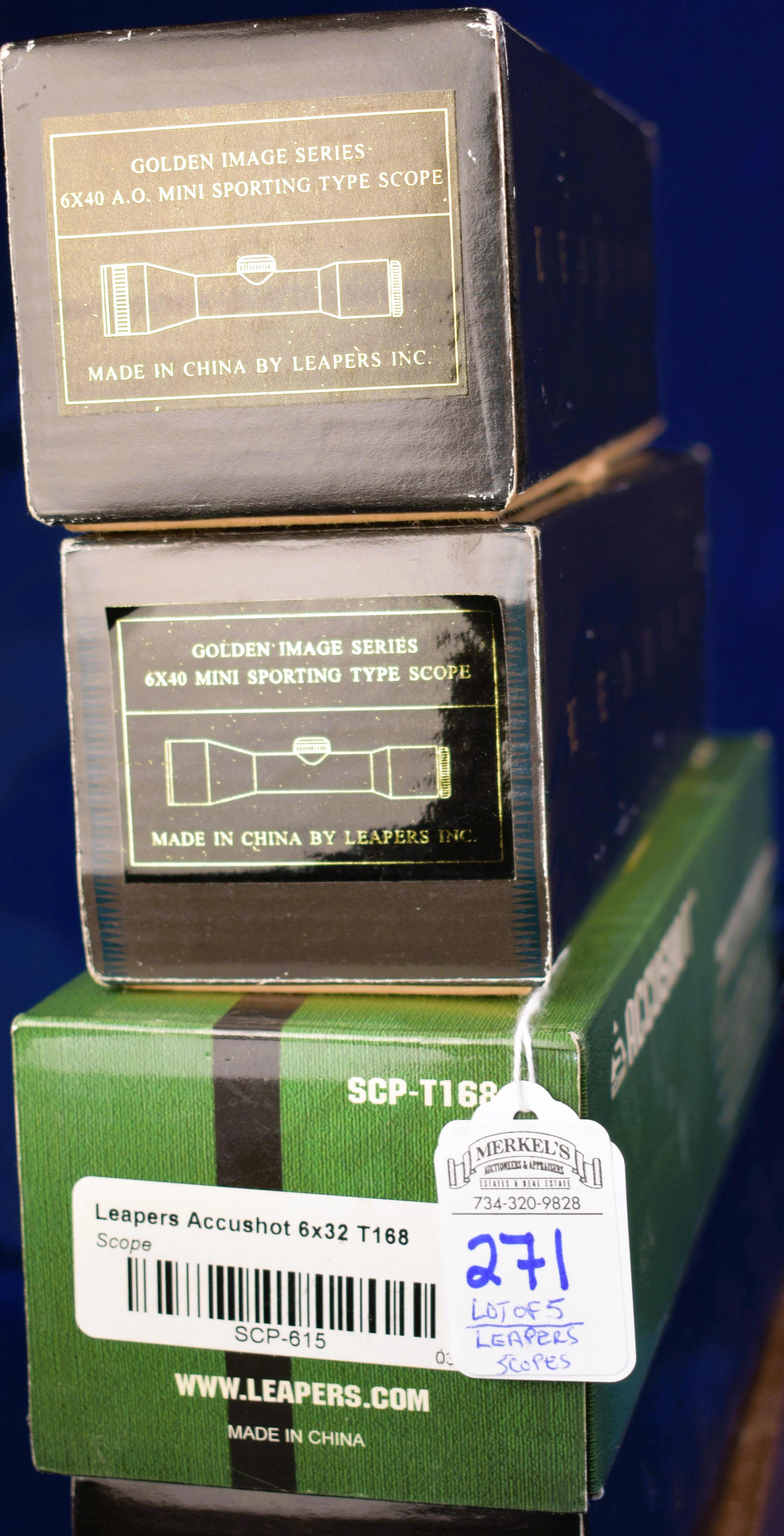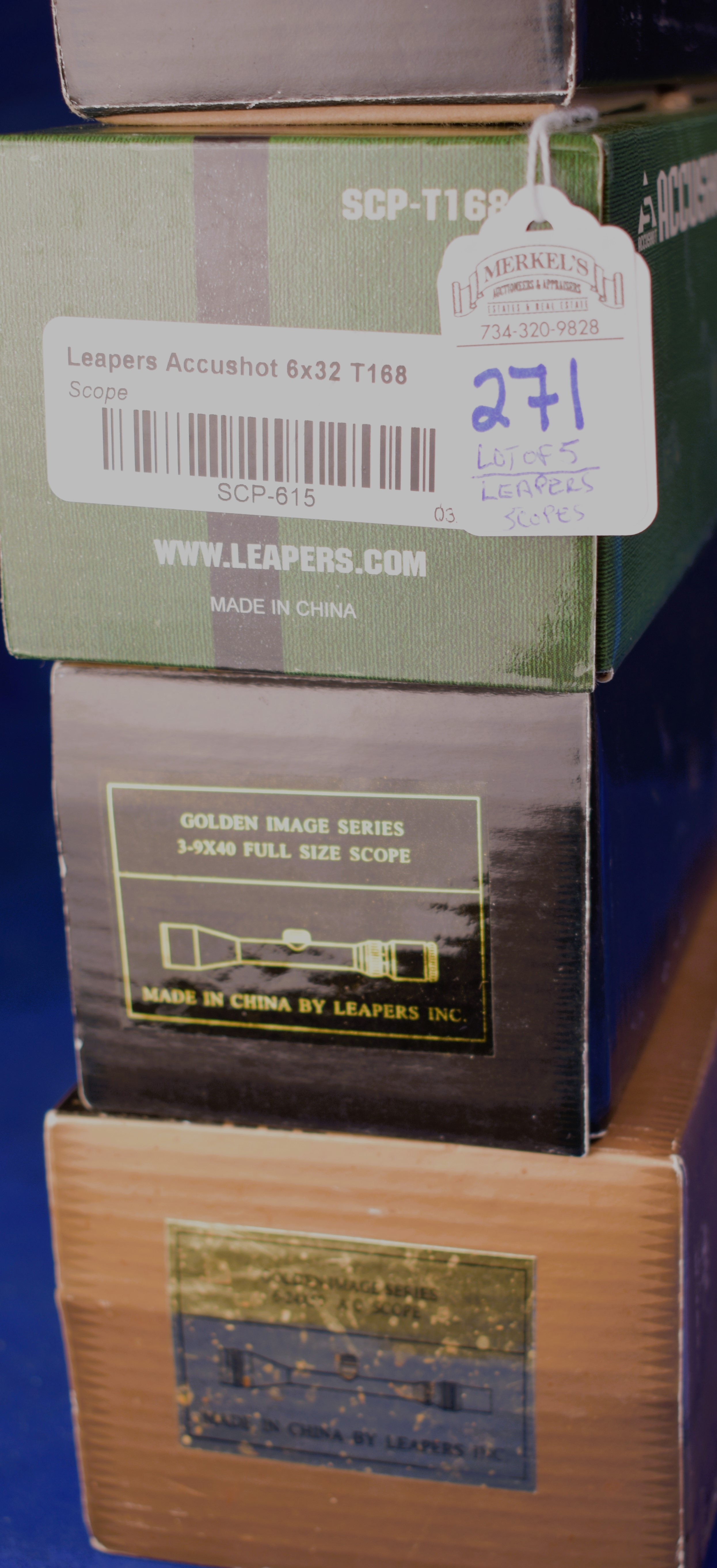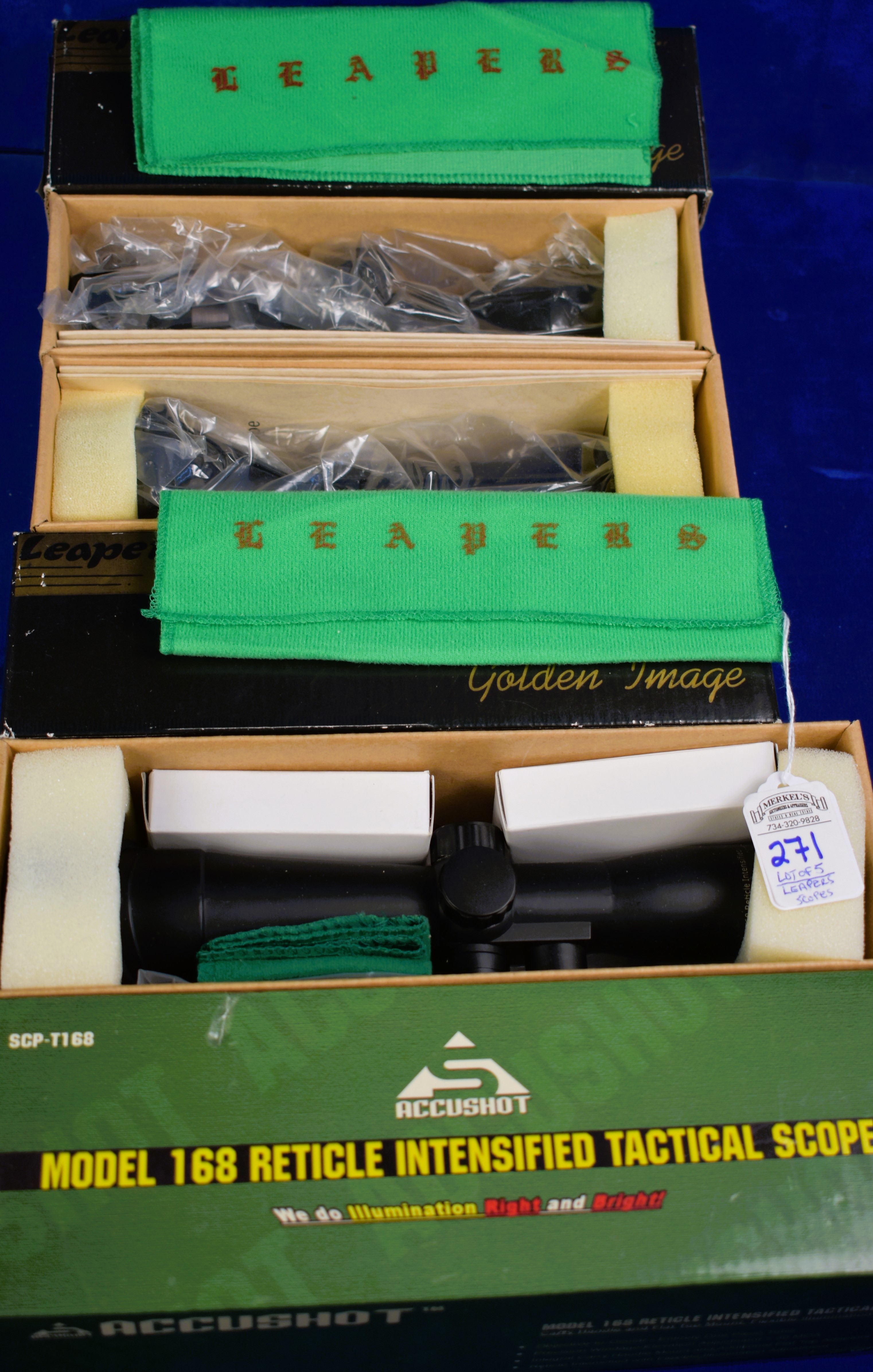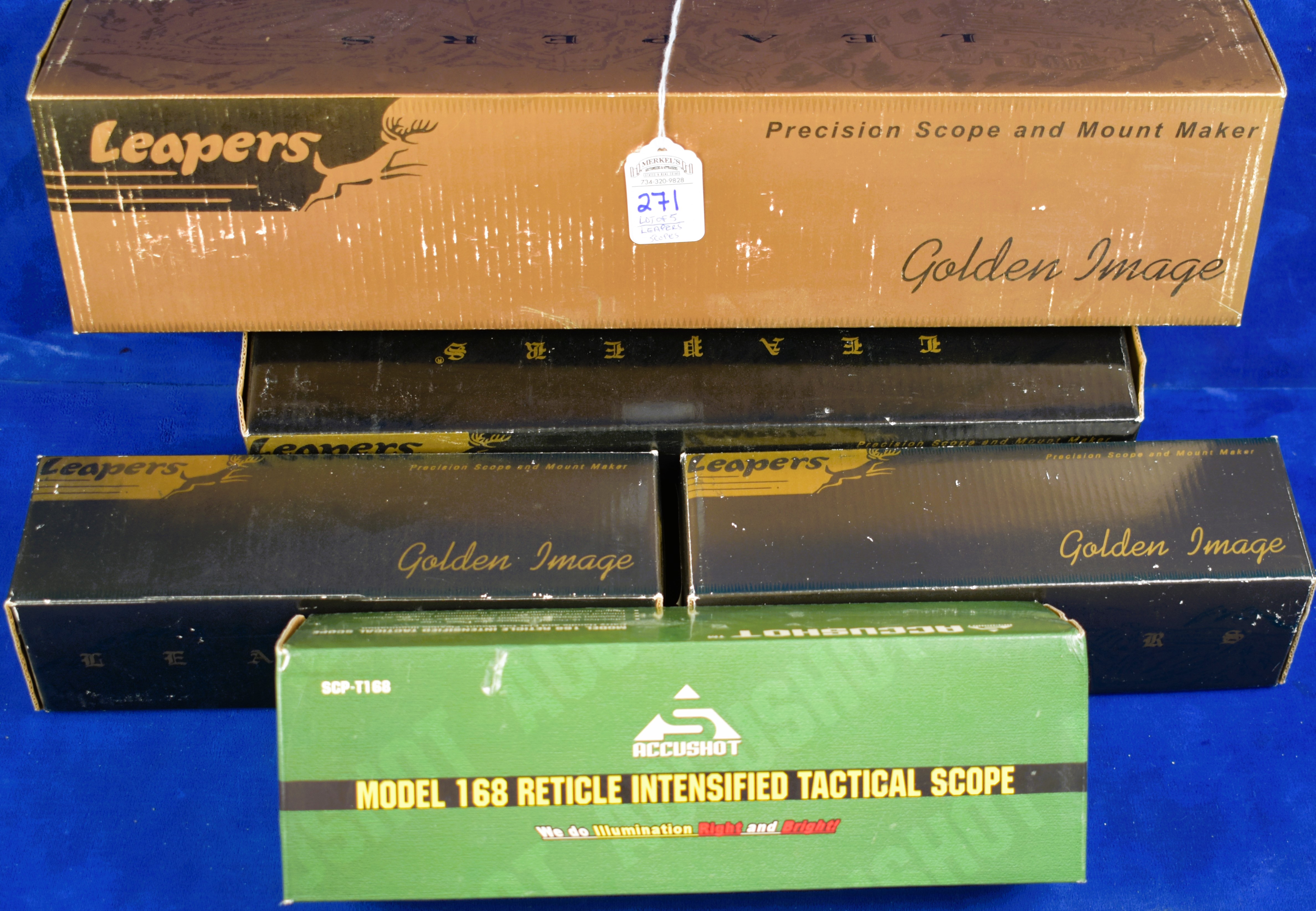 This lot to include: 1.) Leapers – Accushot reticle intensified tactical scope 6 X 32 MM, SCP-T168, 2.) Leapers – Golden Image Series 6 X 40 MM Mini Sporting type Scope, 3.) Leapers – Golden Image Series 6 X 40 MM Mini Sporting type Scope, 4.) Leapers – Golden Image Series 3-9 X 40 MM Full Size Scope, 5.) Leapers – Golden Image Series 6-24 X 50 MM A.O. Scope,