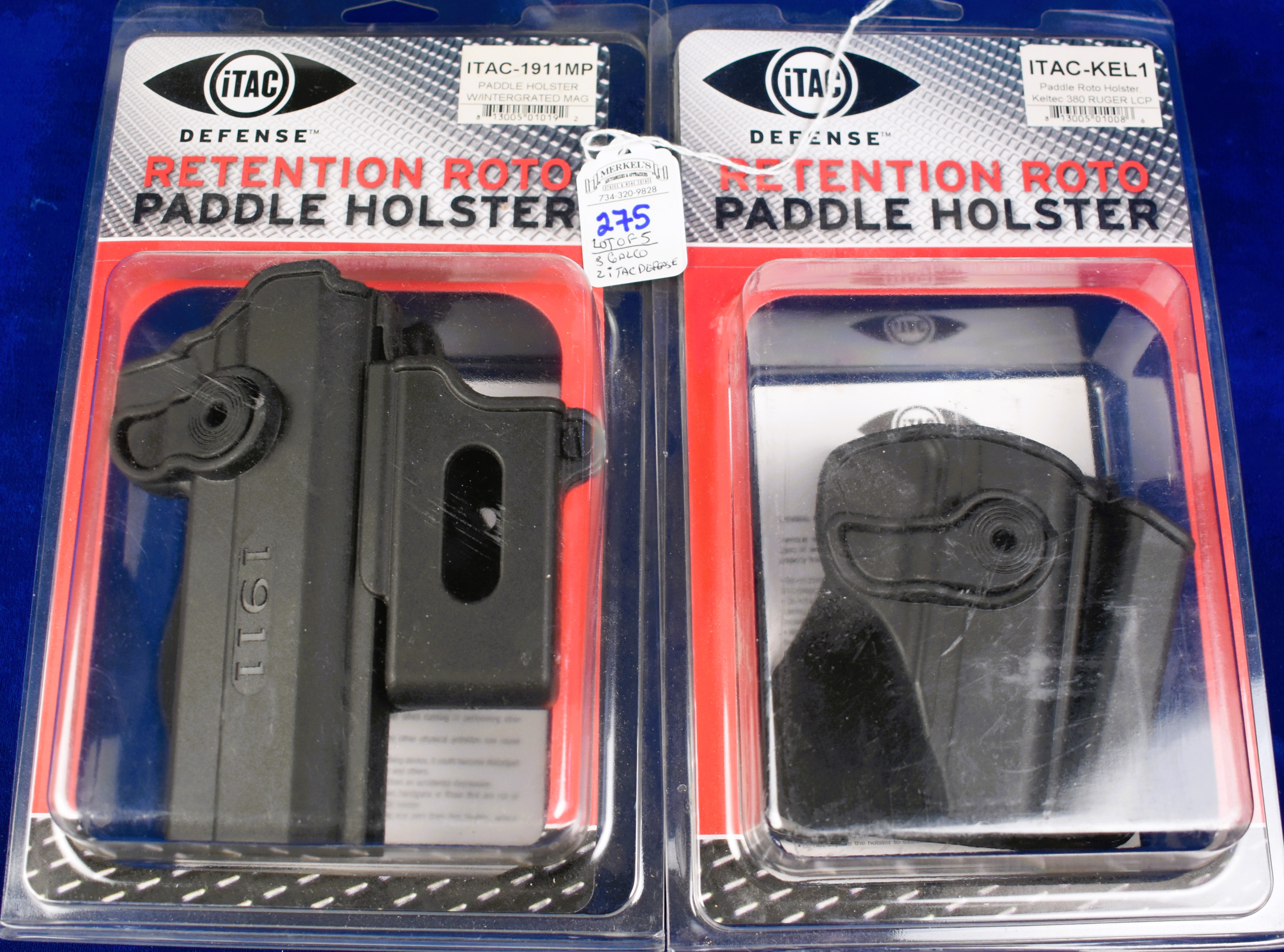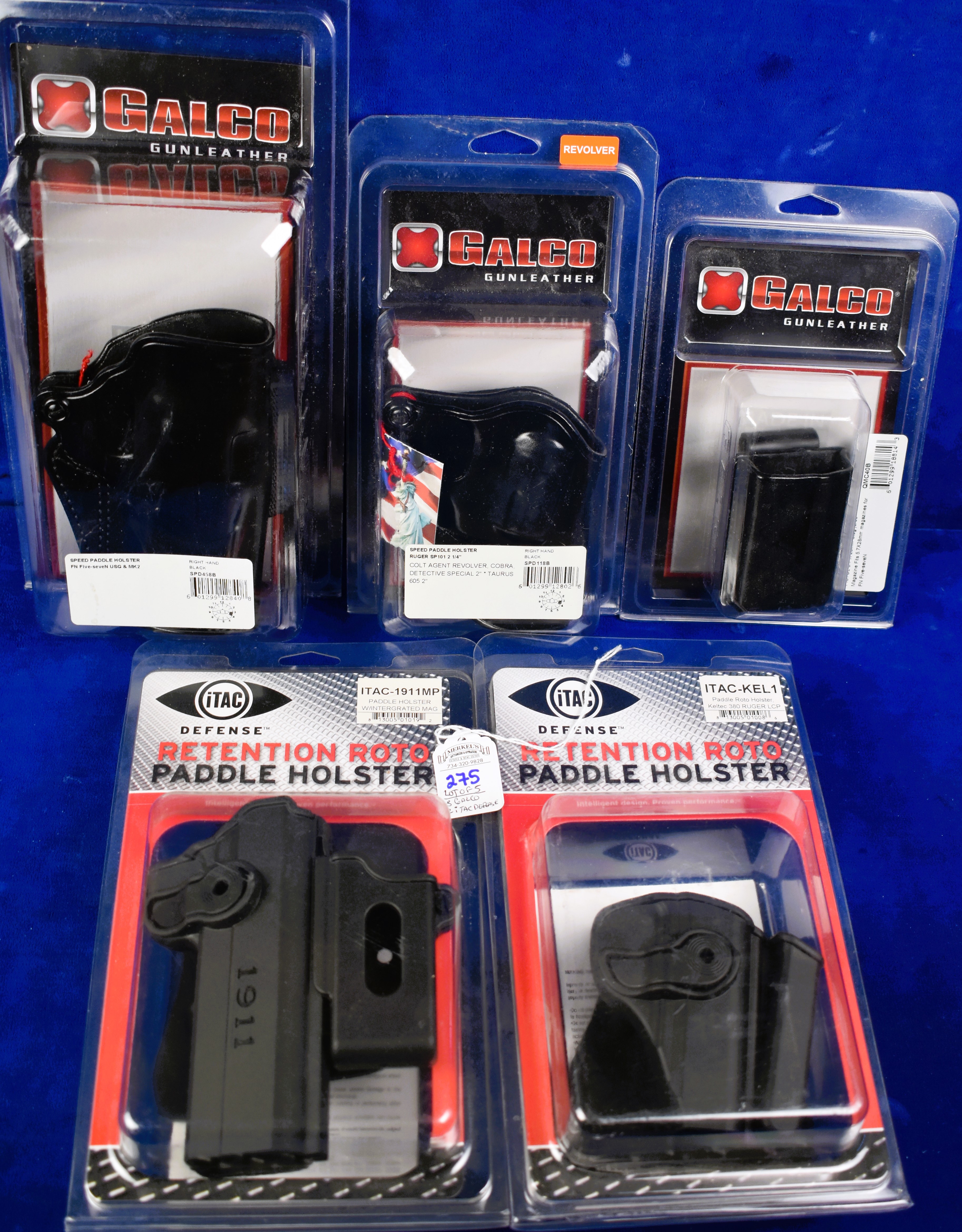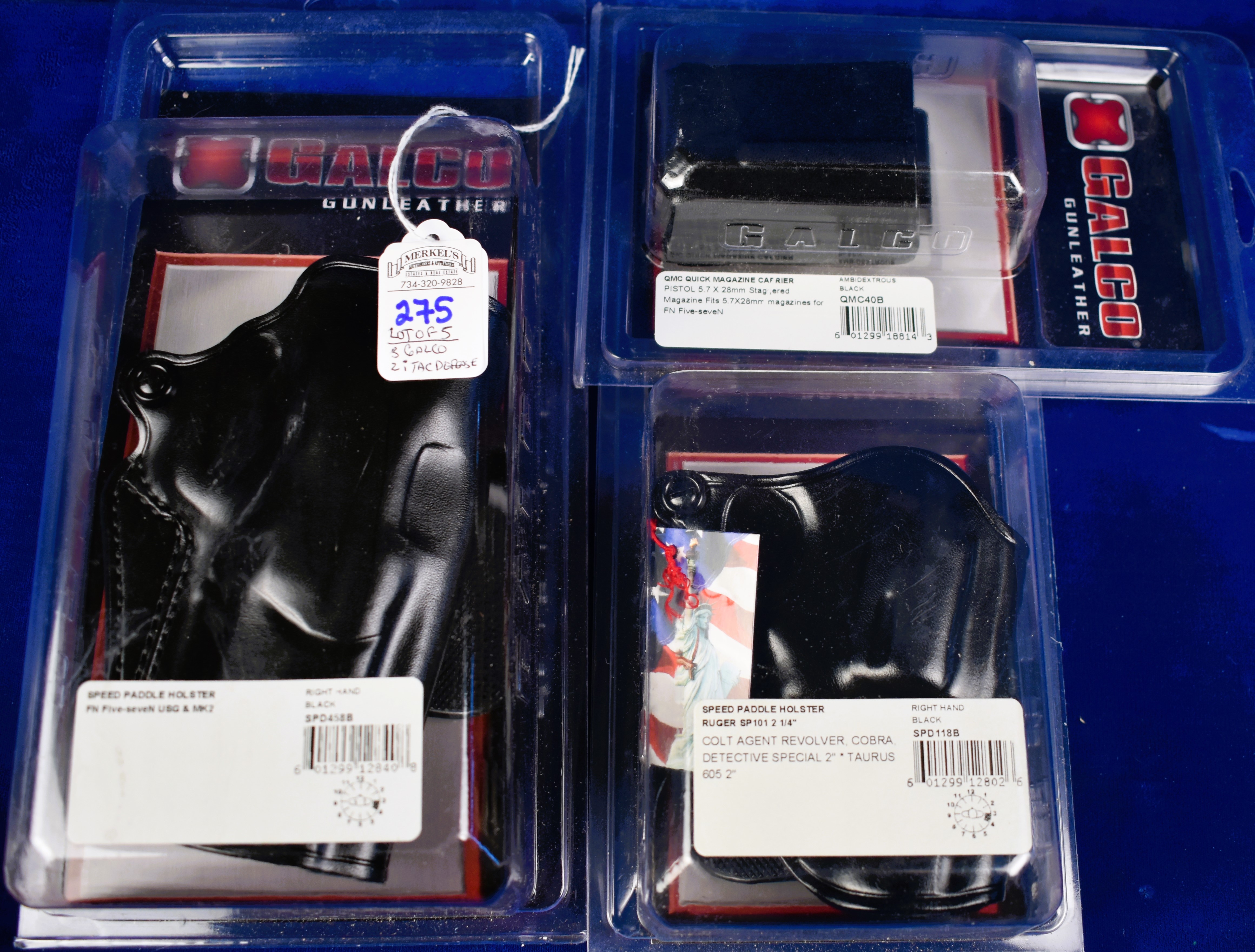 This lot includes: 1 – Galco quick mag carrier for Piston 5.7 X 28 MM; 1 – Galco Speed Paddle Holster Ruger, Colt Agent Revolver, Cobra; 1 – Galco Speed Paddle Holster, Five-SeveN USG & MK2; 1 – iTac Defense Retention Roto Paddle Holster W/intergrated MAG. – ITAC-1911MP and 1 – iTac Defense Retention Roto Paddle Holster, Keltec 380 Ruger LCP.