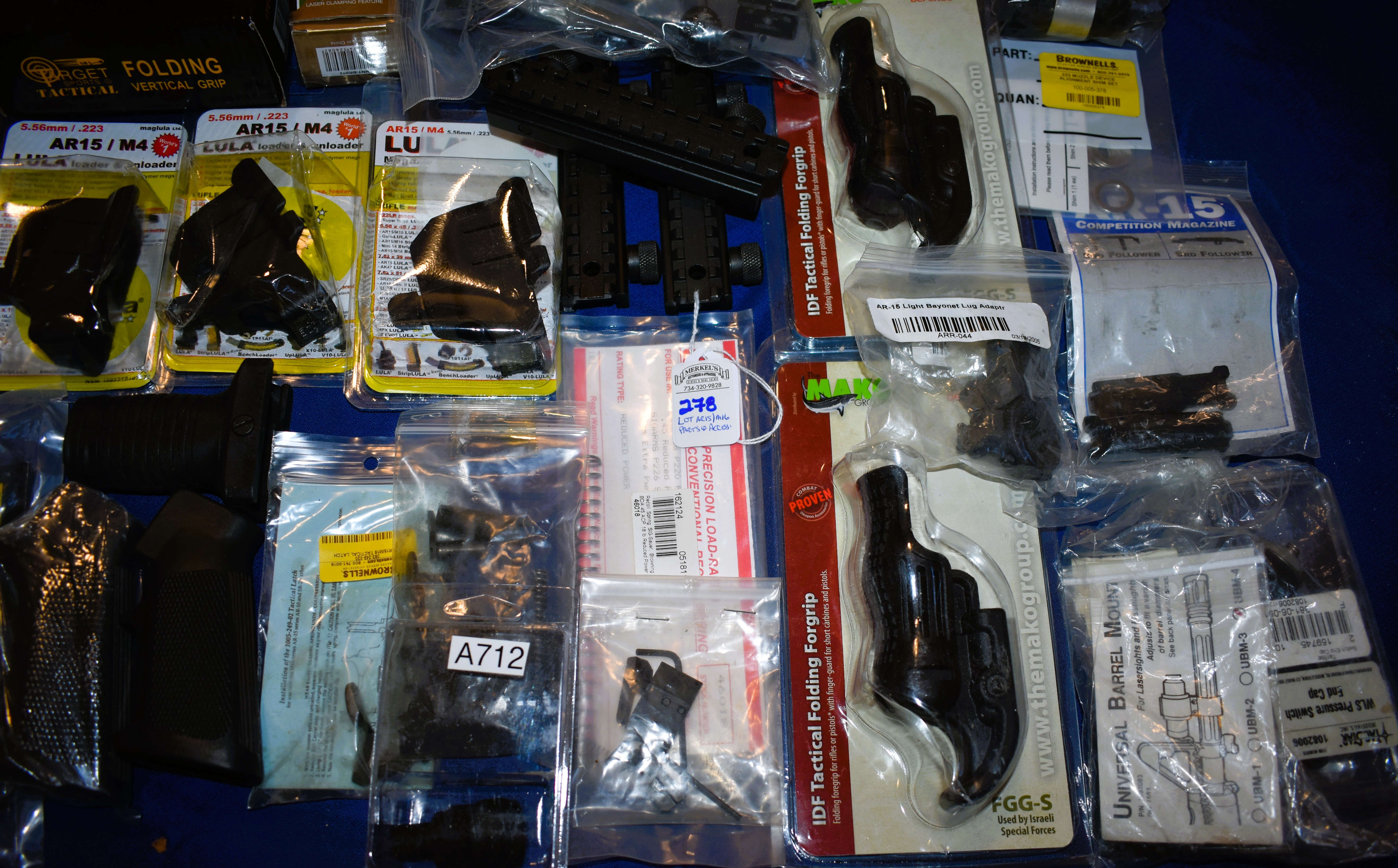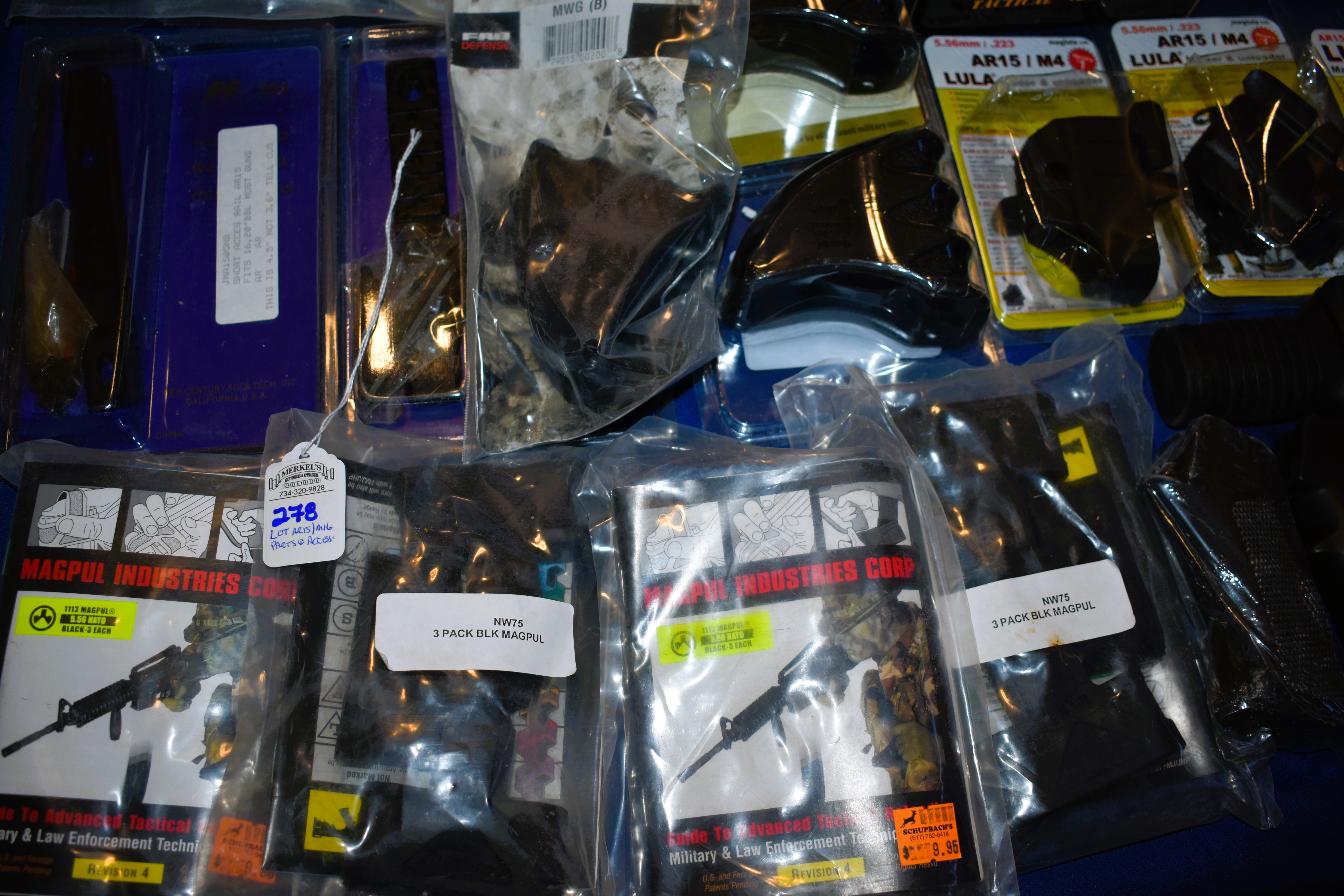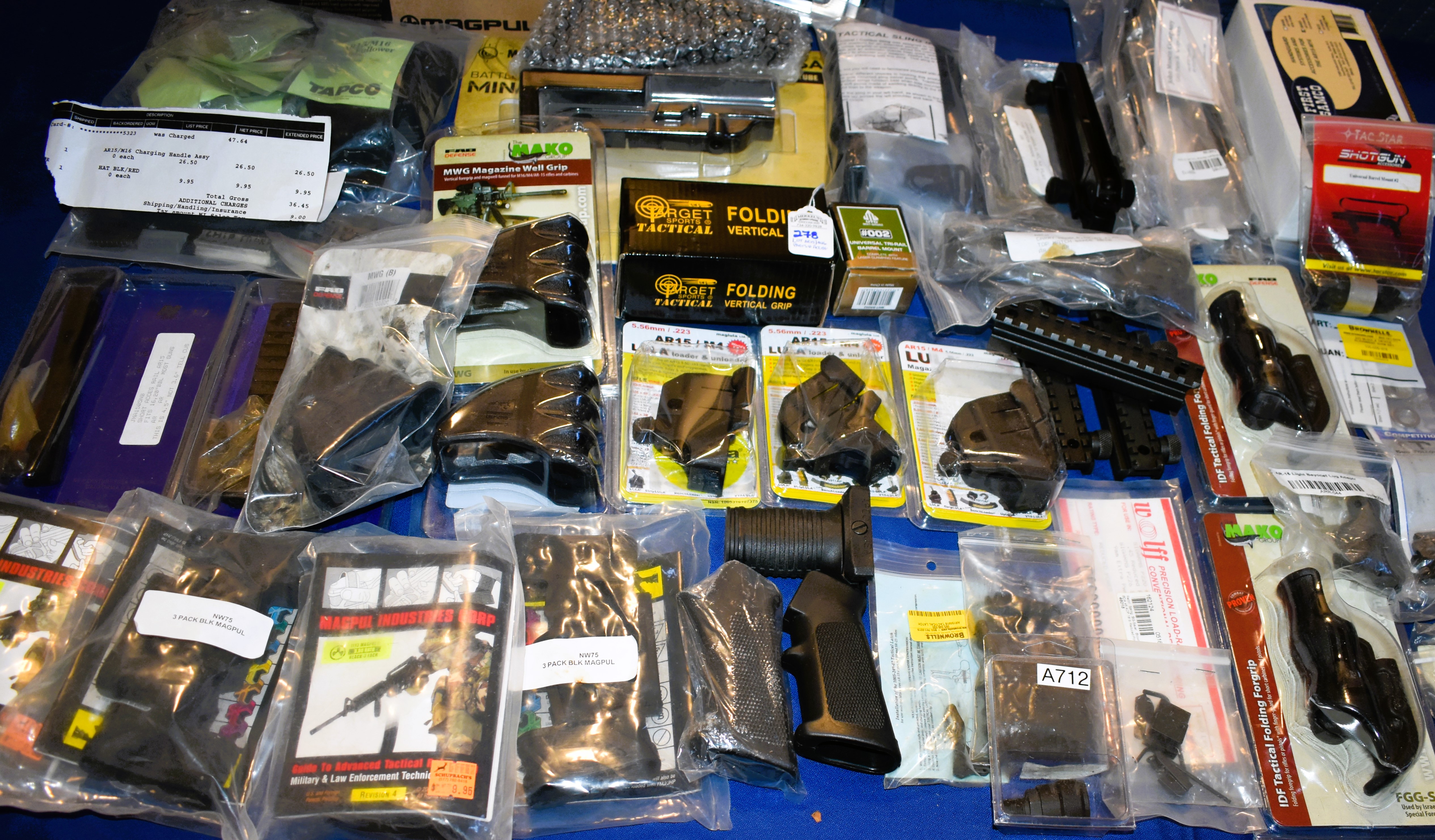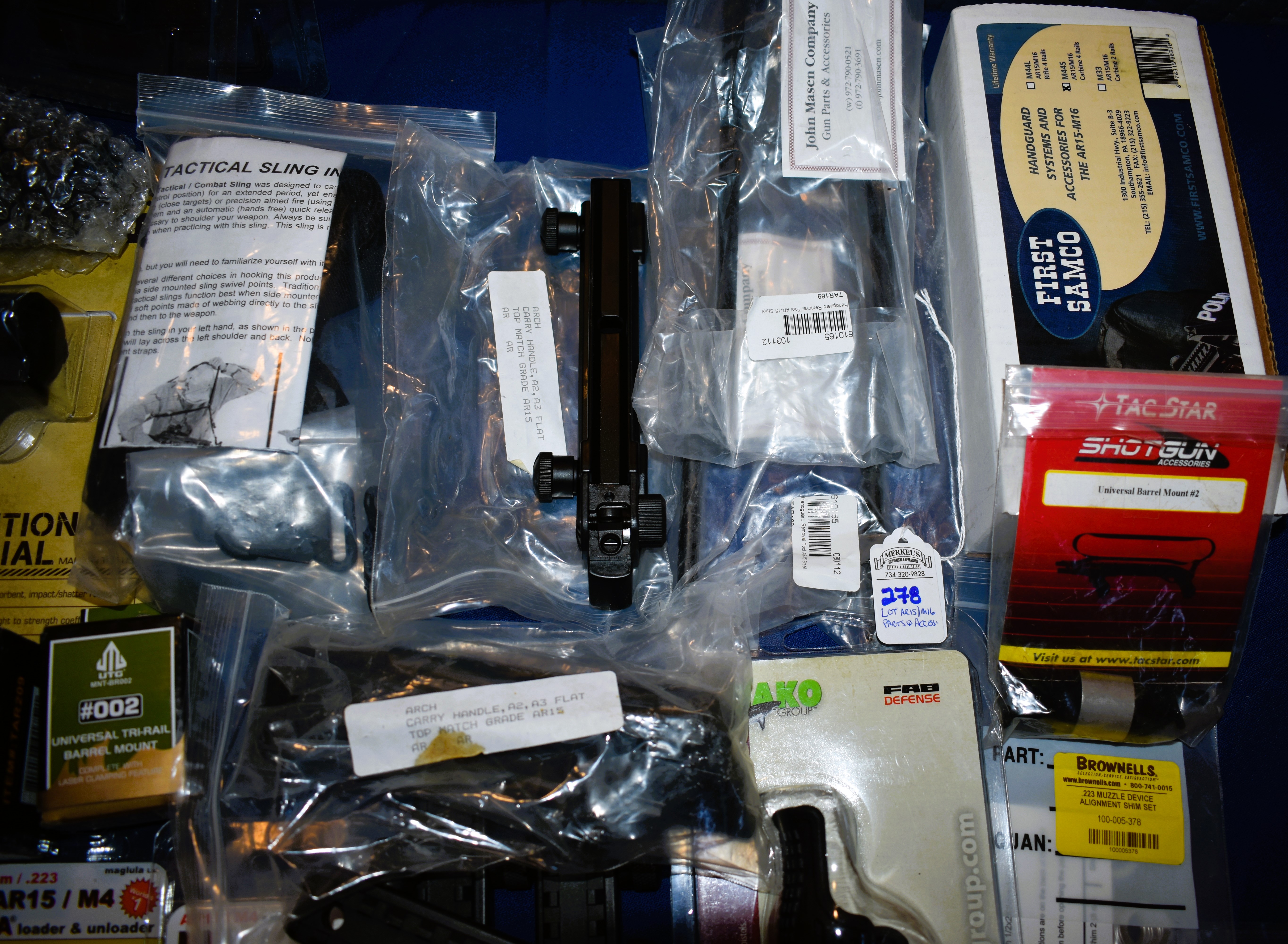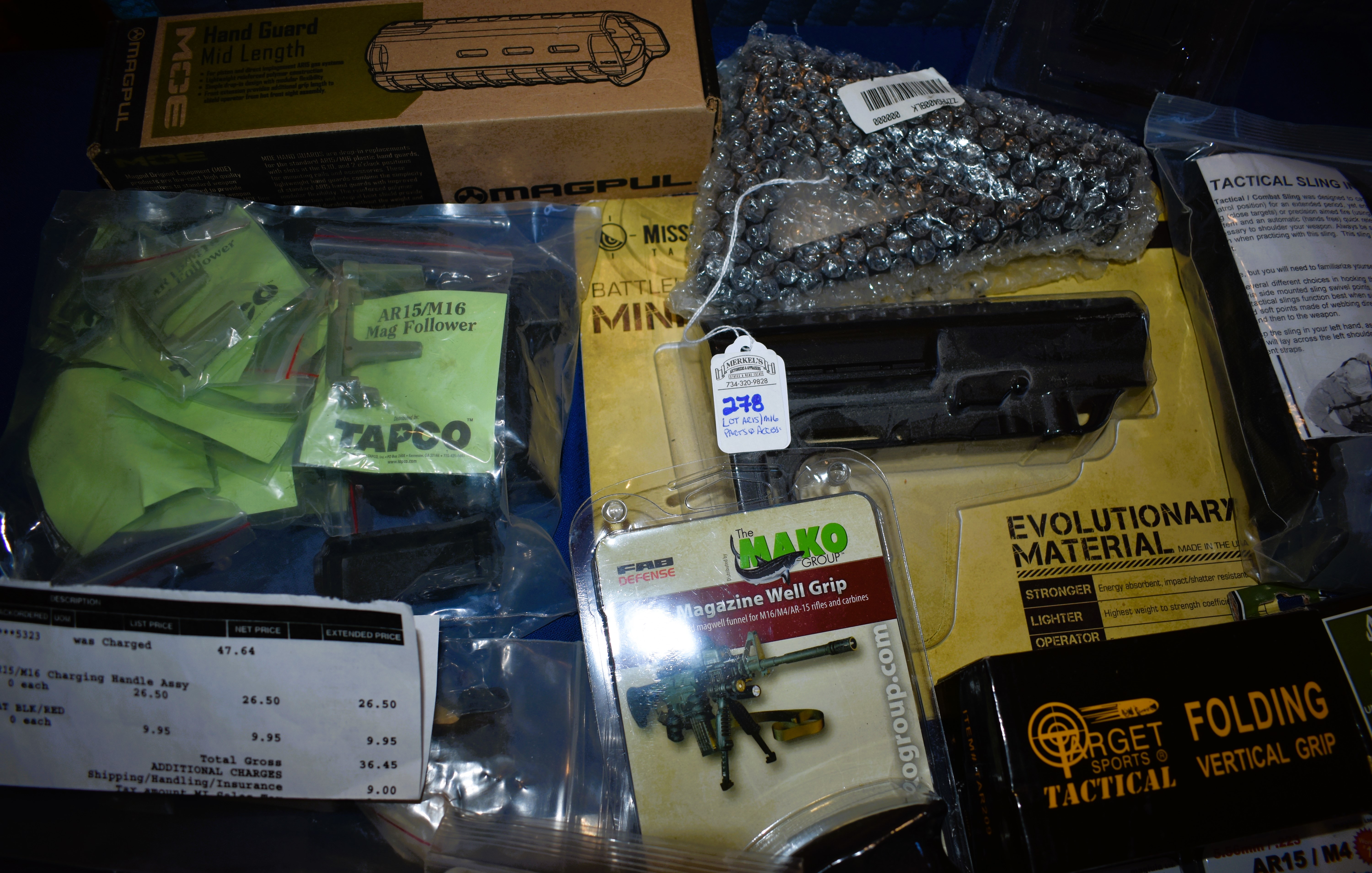 This lot includes 50 plus items. Packages of AR related Parts and Items. Some items are still in their factory packaging. Please see photos for more details.