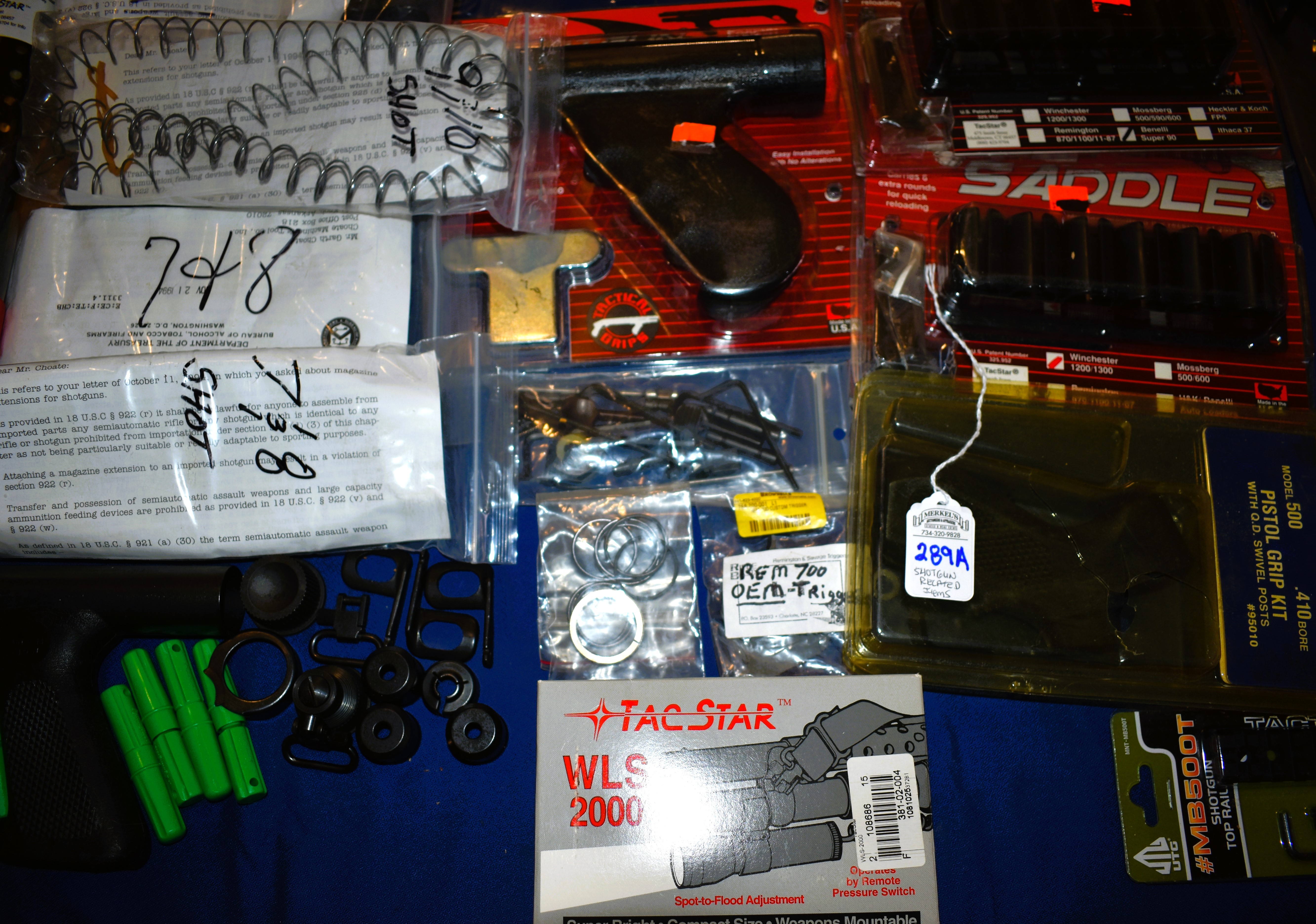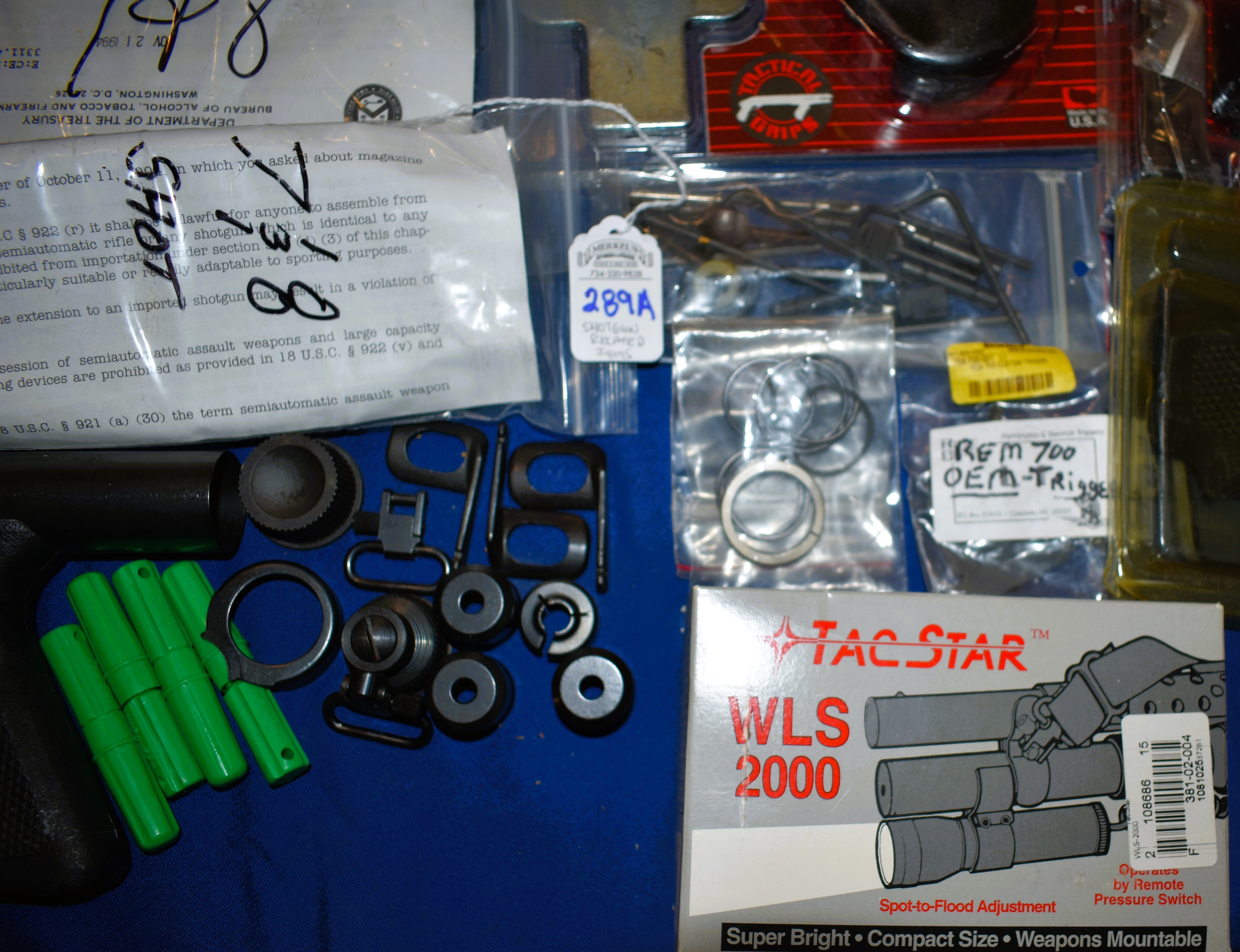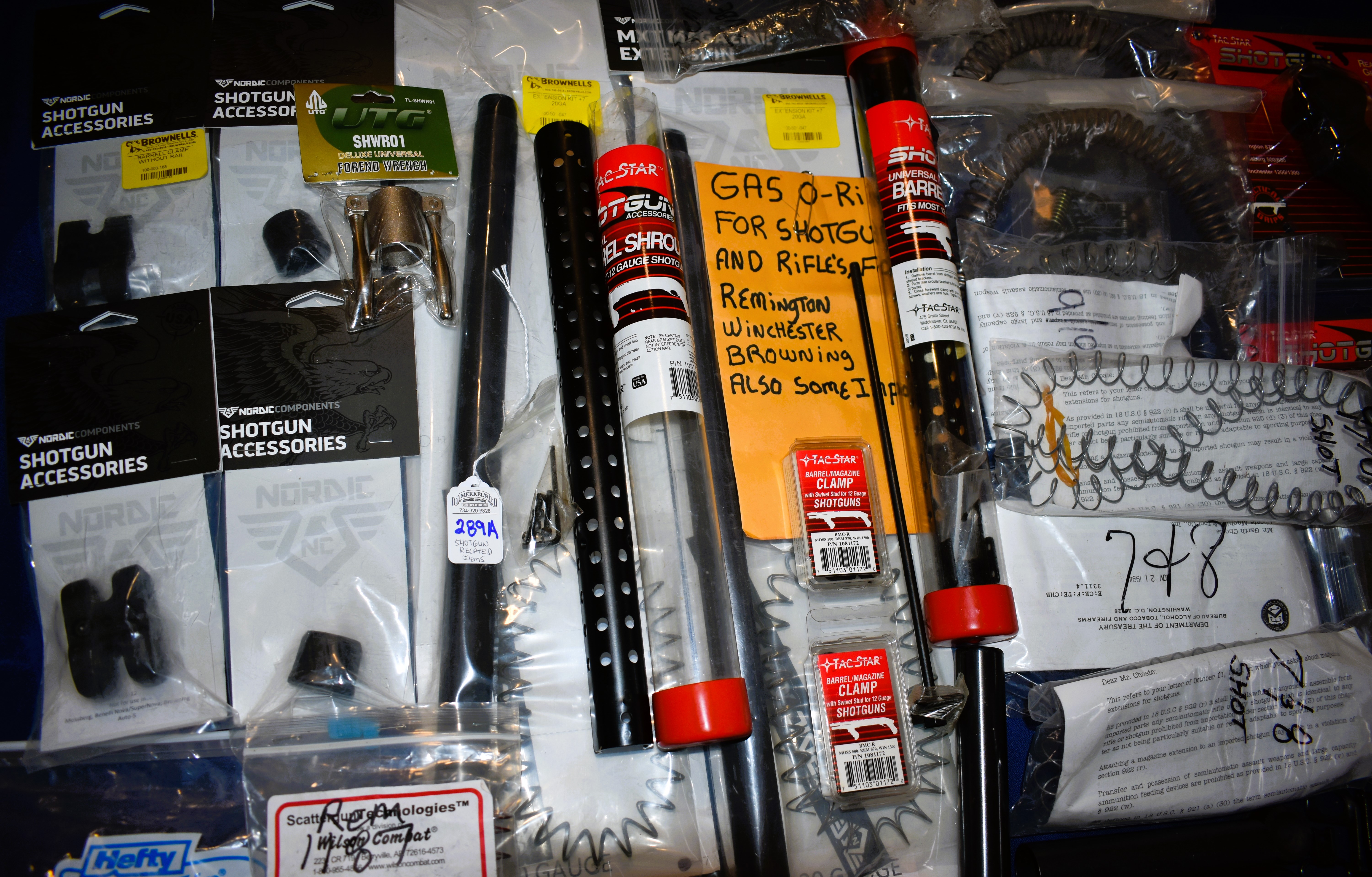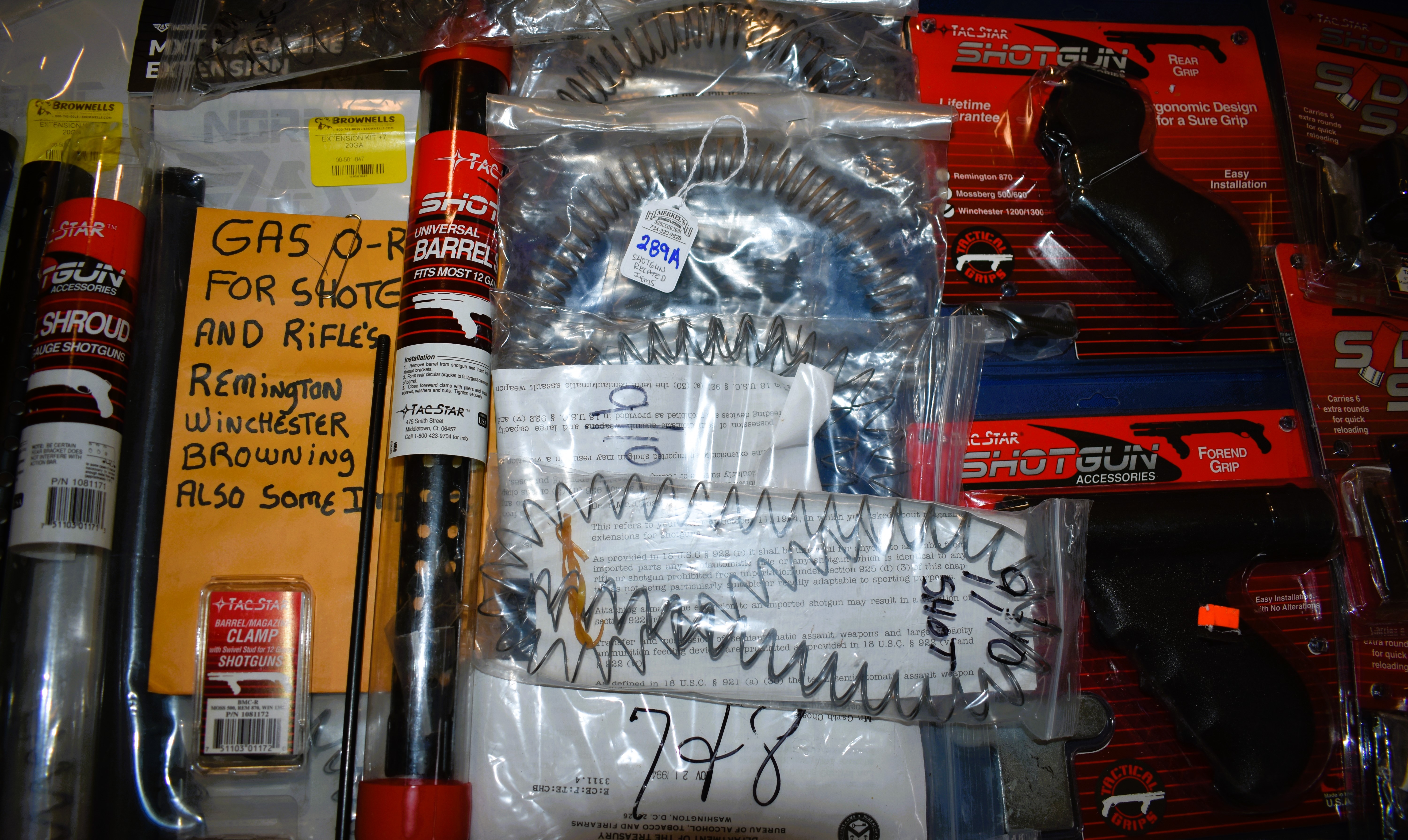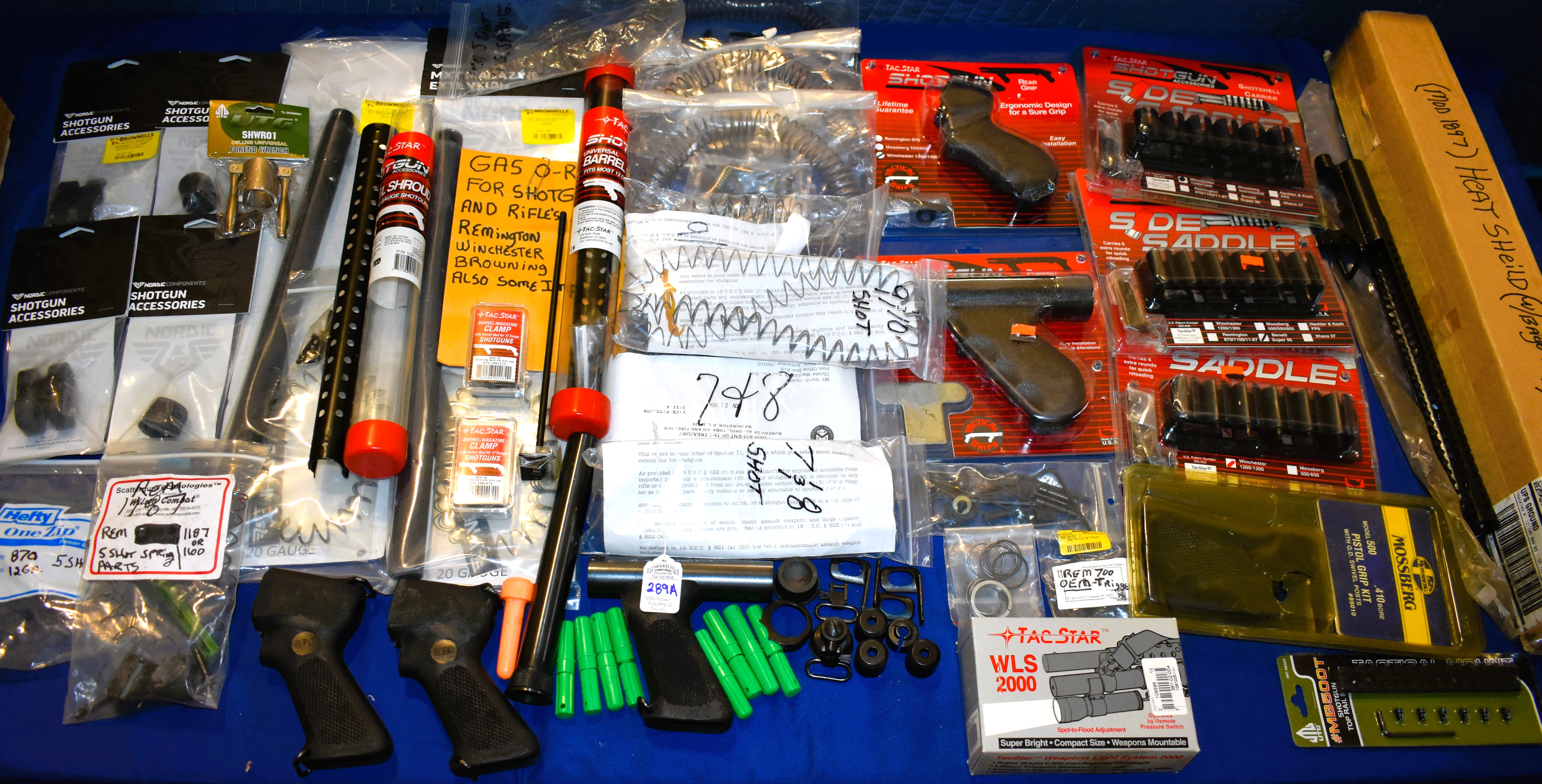 Model 1897 Heat Shield with Bayonet Lug (in Box), Brownell’s Remington 700 Trigger(OEM), (2)Tube Extension Kits for Remington 20GA, Barrel Nuts, Barrel Clamps, Forend Wrench, O-Rings, Shotshell Carriers, Pistol Grips, Tube Springs for 5, 7/8 & 9/10 Shot capacities, (2)Tac-Star Universal Barrel Shrouds for 12 Gauge models and more. Most appear to be Remington related items although some are not as reflected in the photos.