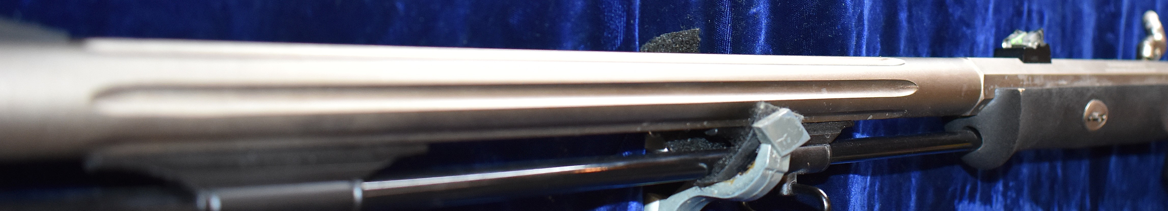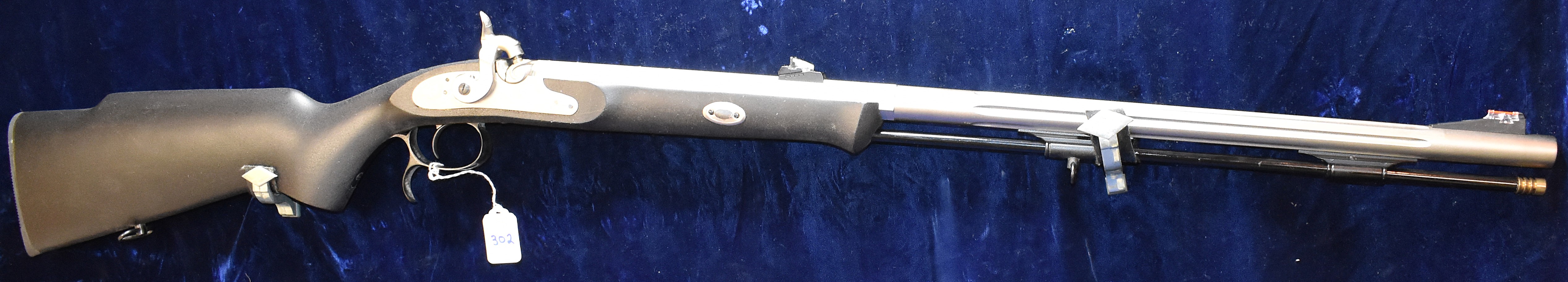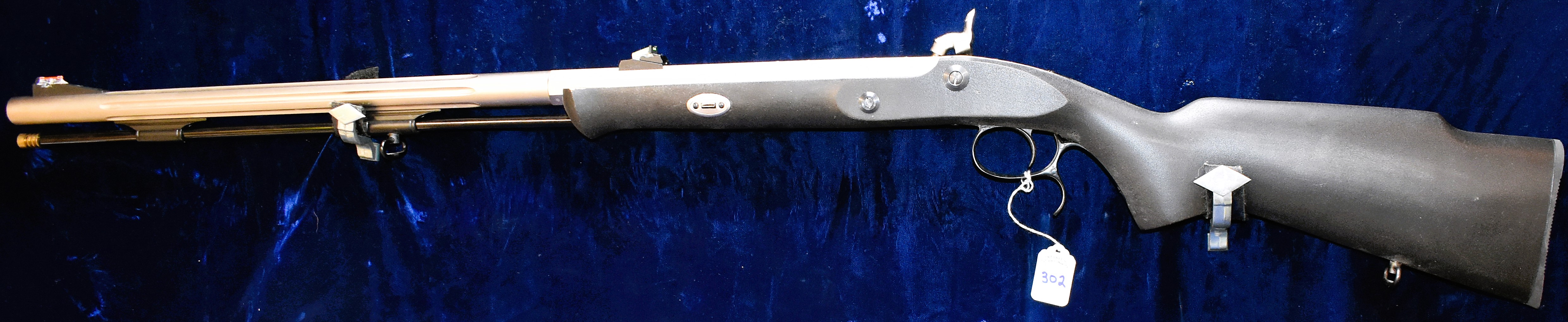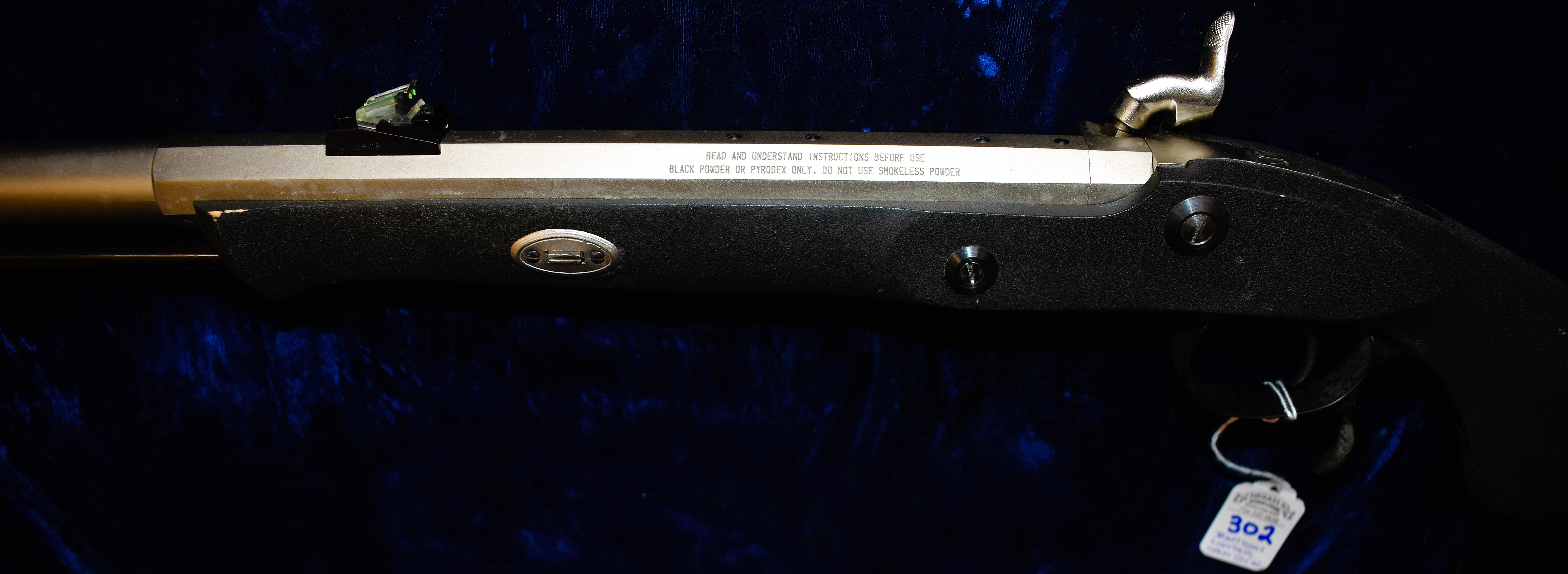 Traditions SPAIN Lightning Fire Side Lock 50 Caliber Muzzle Loader. This example has 28" Half Octoagon/ Half Fluted Round Barrel and marked Lightning-Fire Side Lock 50 Caliber 1:32 bearing Serial# 14-13-023938-99 on a Black Synthetic Stock. Barrel has HIGH VIS Sights. Buckhorn sight is Green and Front Blade Sight is Orange.