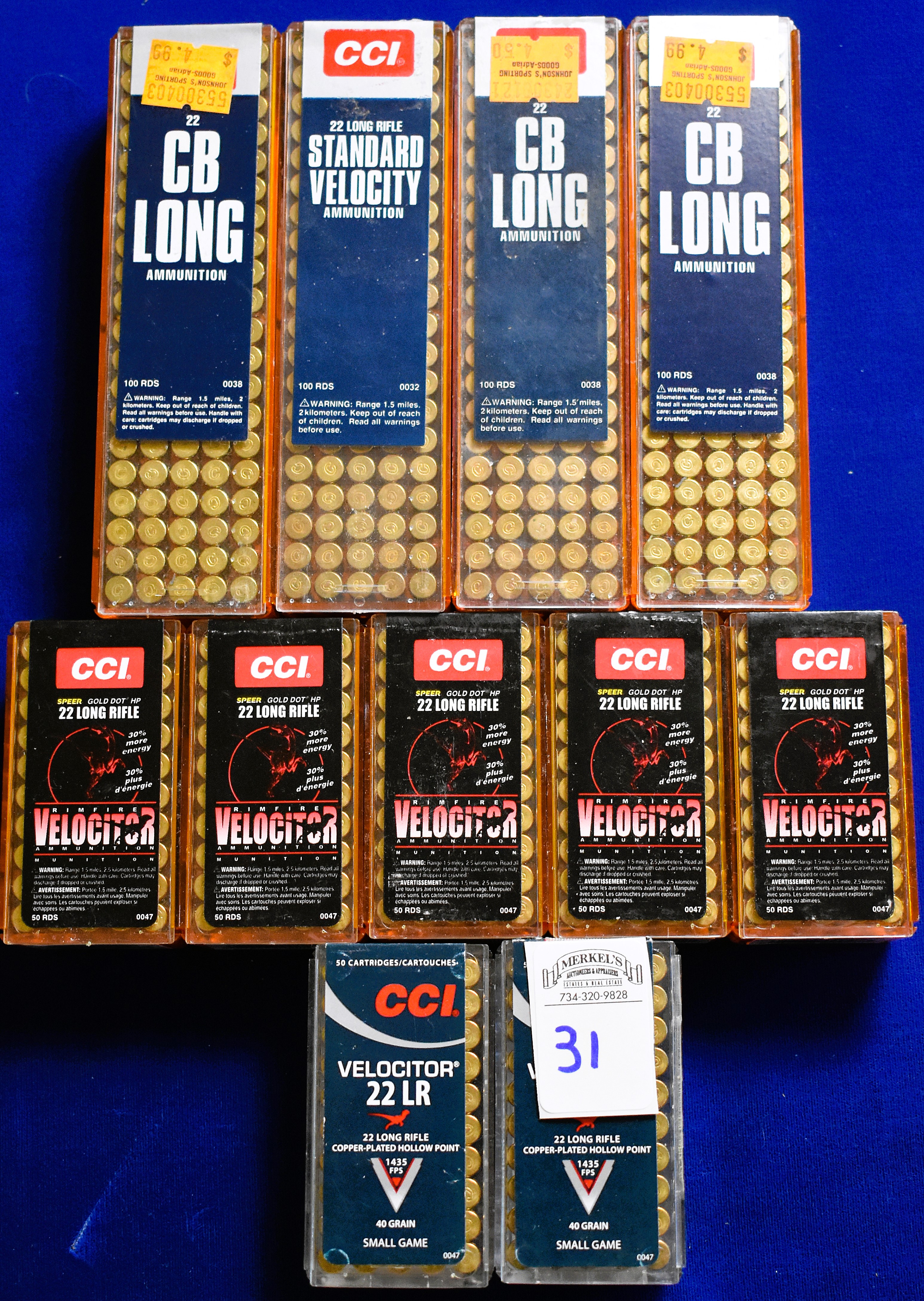 Factory New Old Stock- 750 Rounds (11 Boxes) 2 boxes – CCI Velocitor 22 LR Copper Plated HP 40 gr. 50 count. 5 boxes – CCI Velocitor Speer Gold Dot HP 22 LR 50 count. 3 boxes – CCI 22 CB Long 100 count. 1 box CCI Standard Velocity 22 LR 100 count. Shipping ONLY UPS GROUND due to regulations.