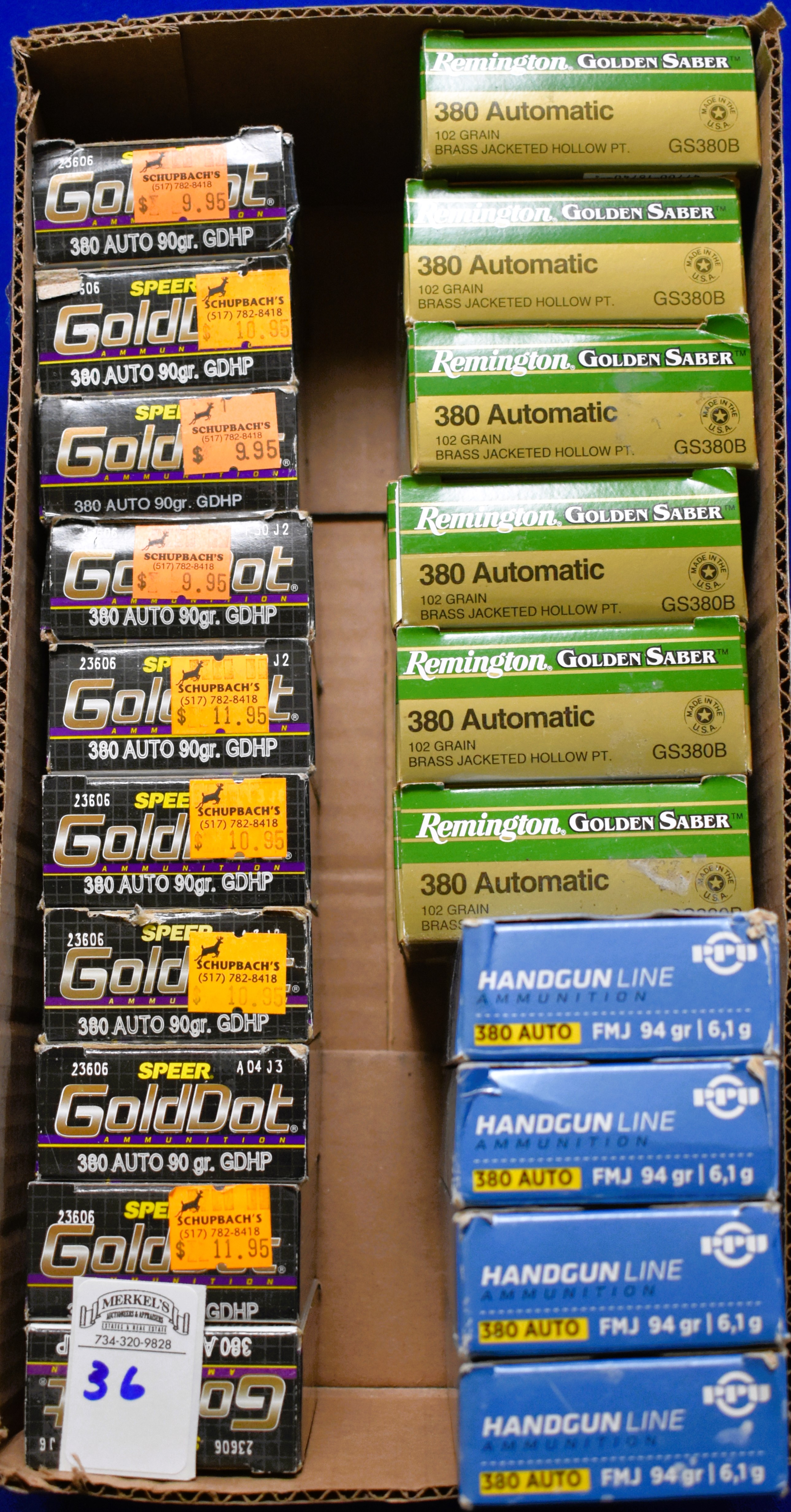 Factory New Old Stock-550 Rounds (20 Boxes) Various Mfg. of 380 Auto. 4 boxes – PPU Handgun Line 380 Auto FJM 94 Gr. 6 boxes – Remington Golden Saber 380 Auto 102 gr. Brass Jacketed HP. 10 boxes – Speer GoldDot 380 Auto 90 Gr. GDHP. Shipping ONLY UPS GROUND due to regulations.