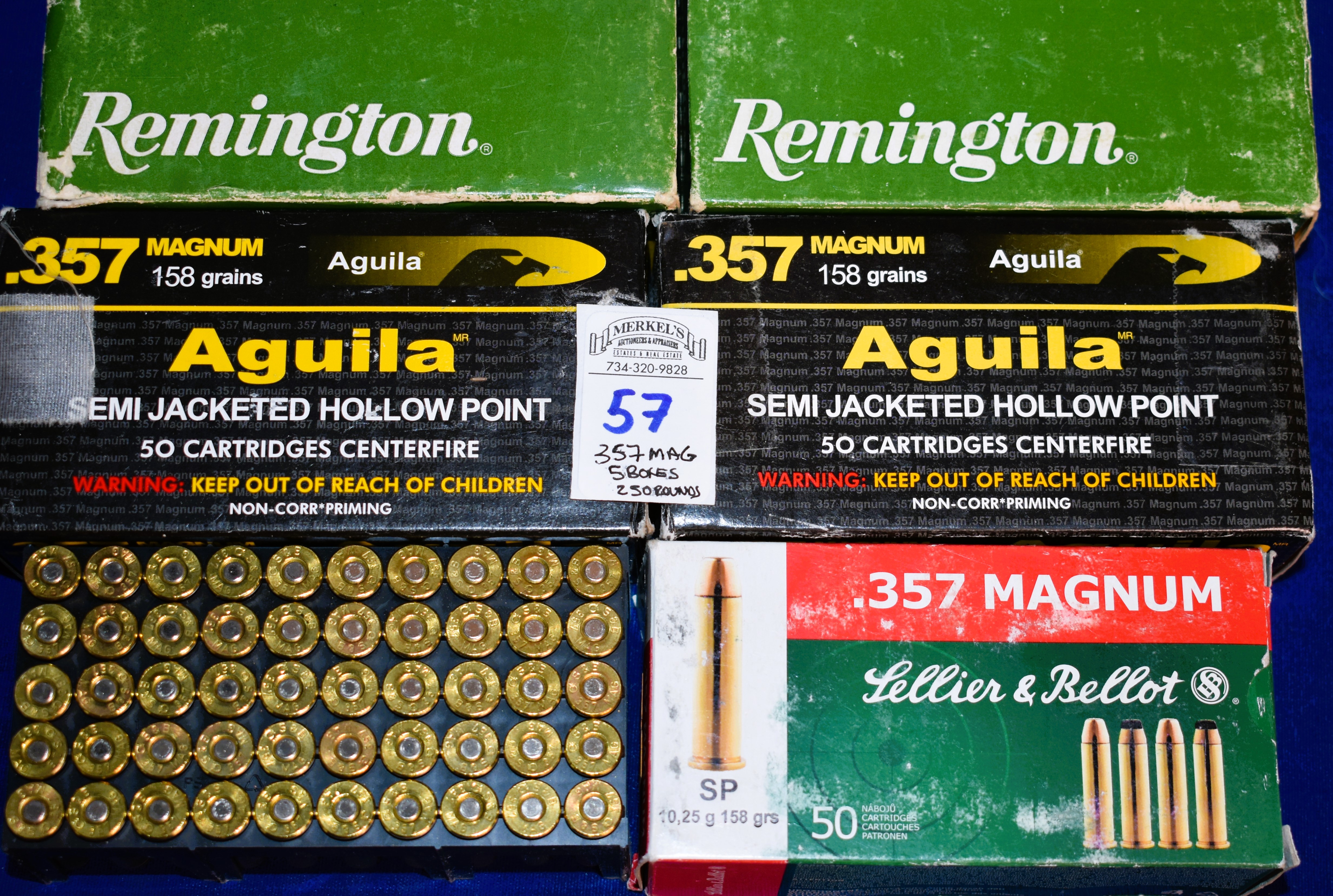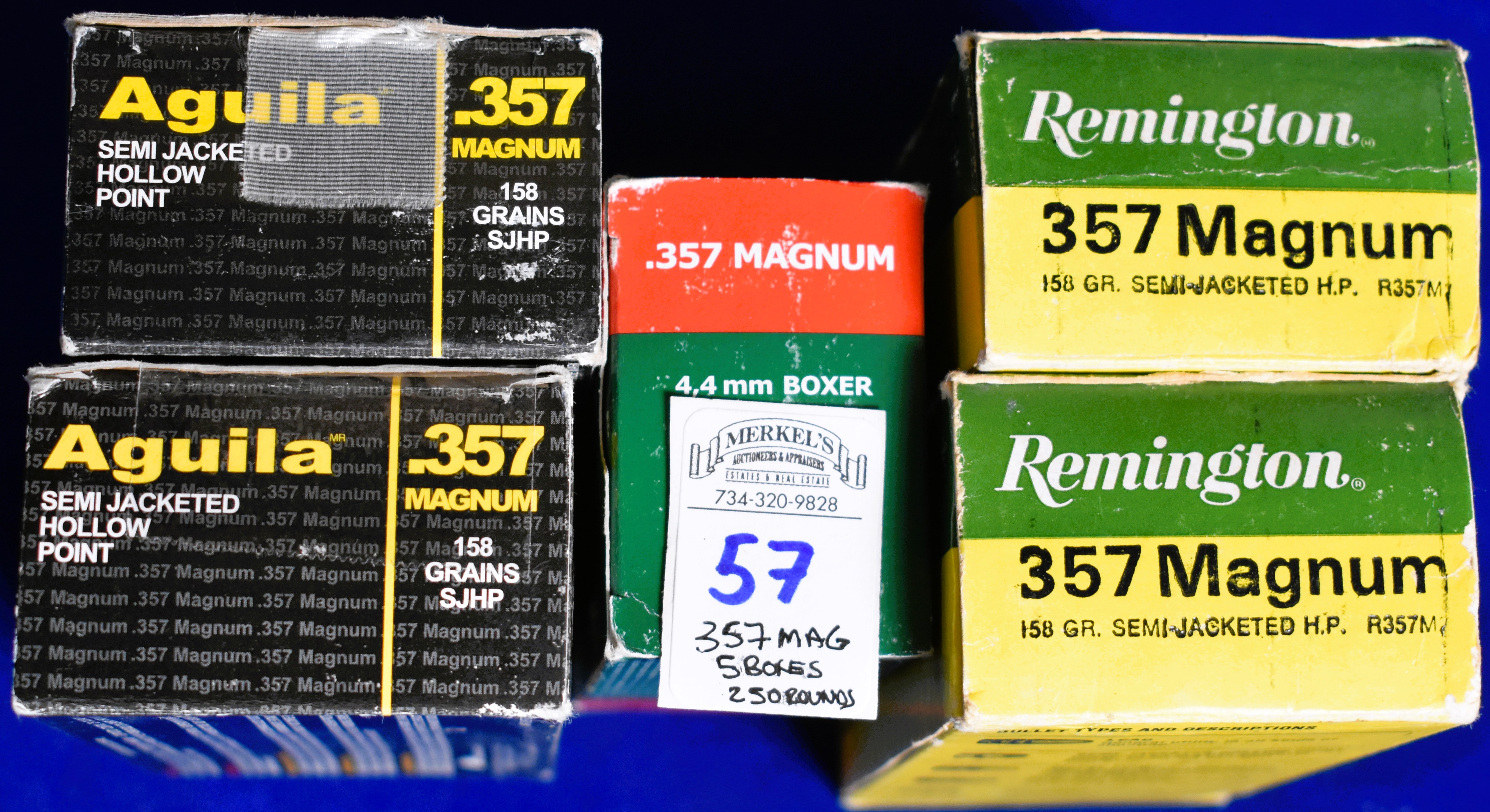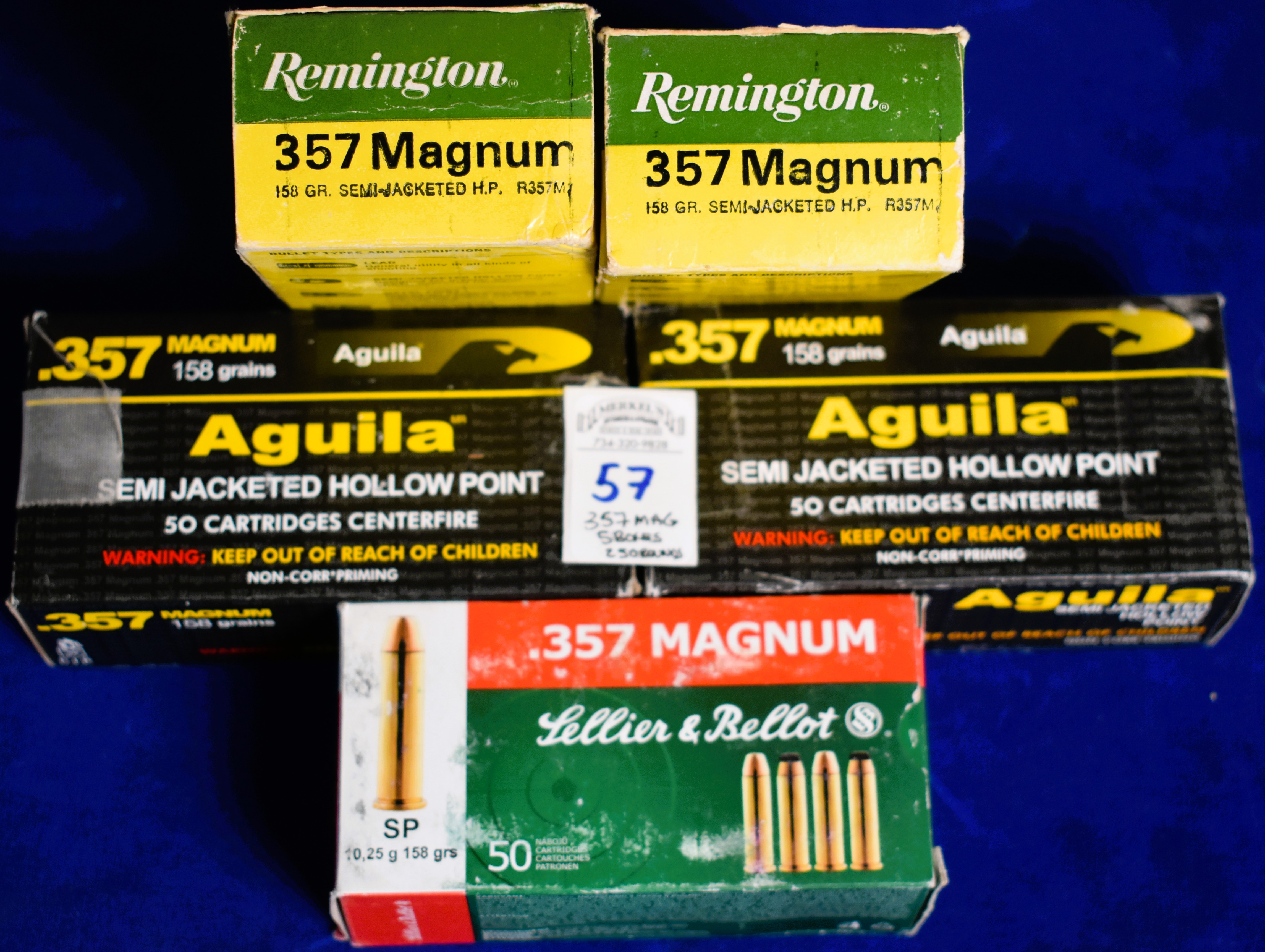 Factory New Old Stock -250 Rounds (5 Boxes) Various Mfg. of 357 Magnum. 1 box – Sellier & Bellot 158 gr. SP, 2 boxes – Remington 357 Magnum 158 gr. Semi-Jacketed HP, 2 boxes – Aguila 357 Magnum 158 gr. SJHP. Shipping ONLY UPS GROUND due to regulations.