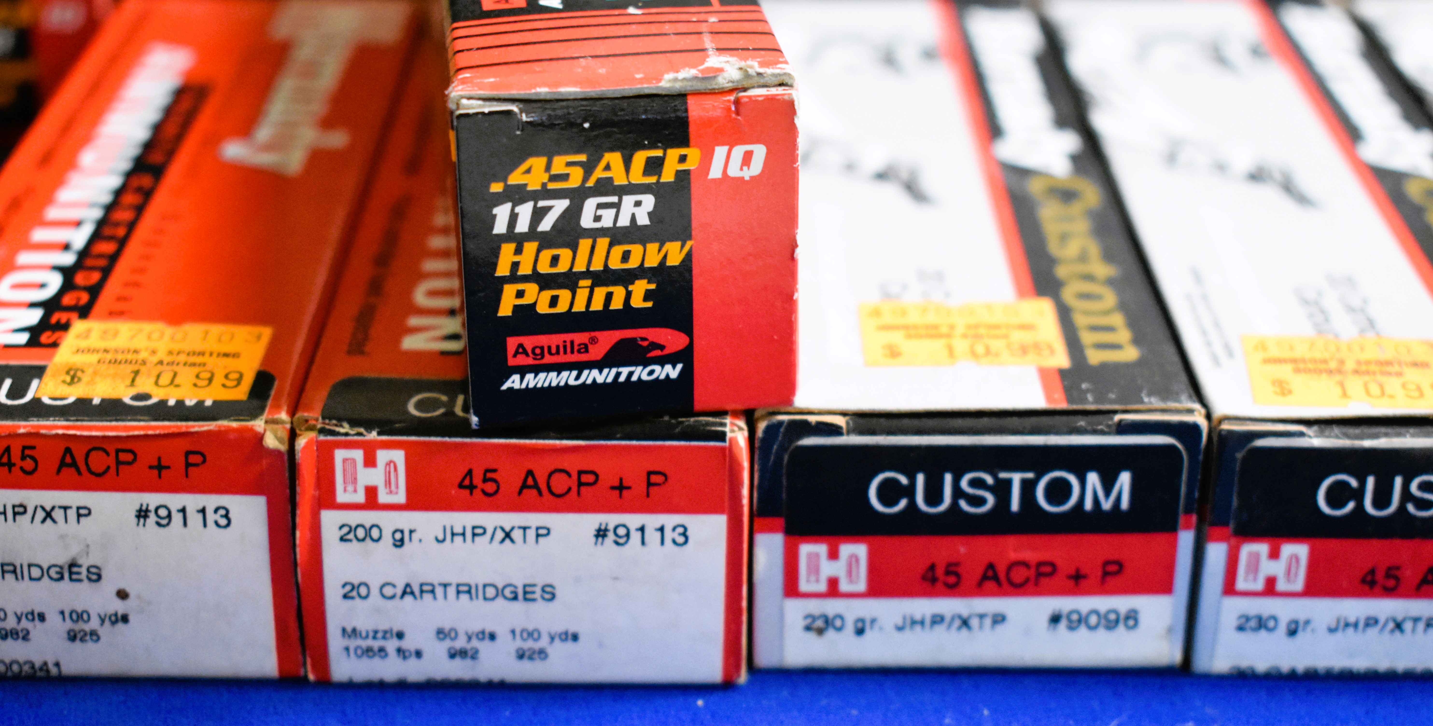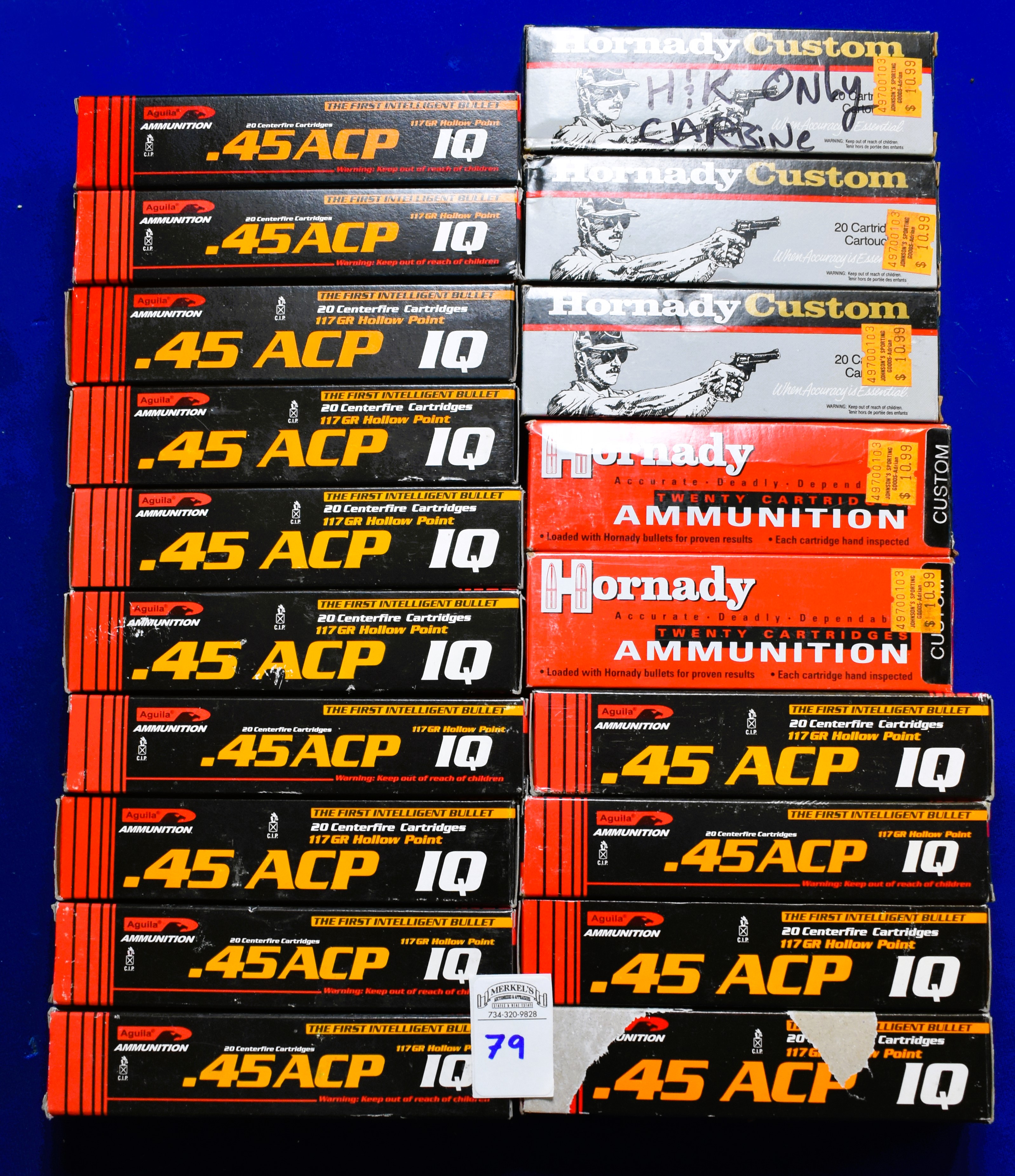 Factory New Old Stock -360 Rounds (18 Boxes) Various Mfgs. of 45 Auto – please see pictures for mfg. and quantity of boxes. Shipping ONLY UPS GROUND due to regulations.