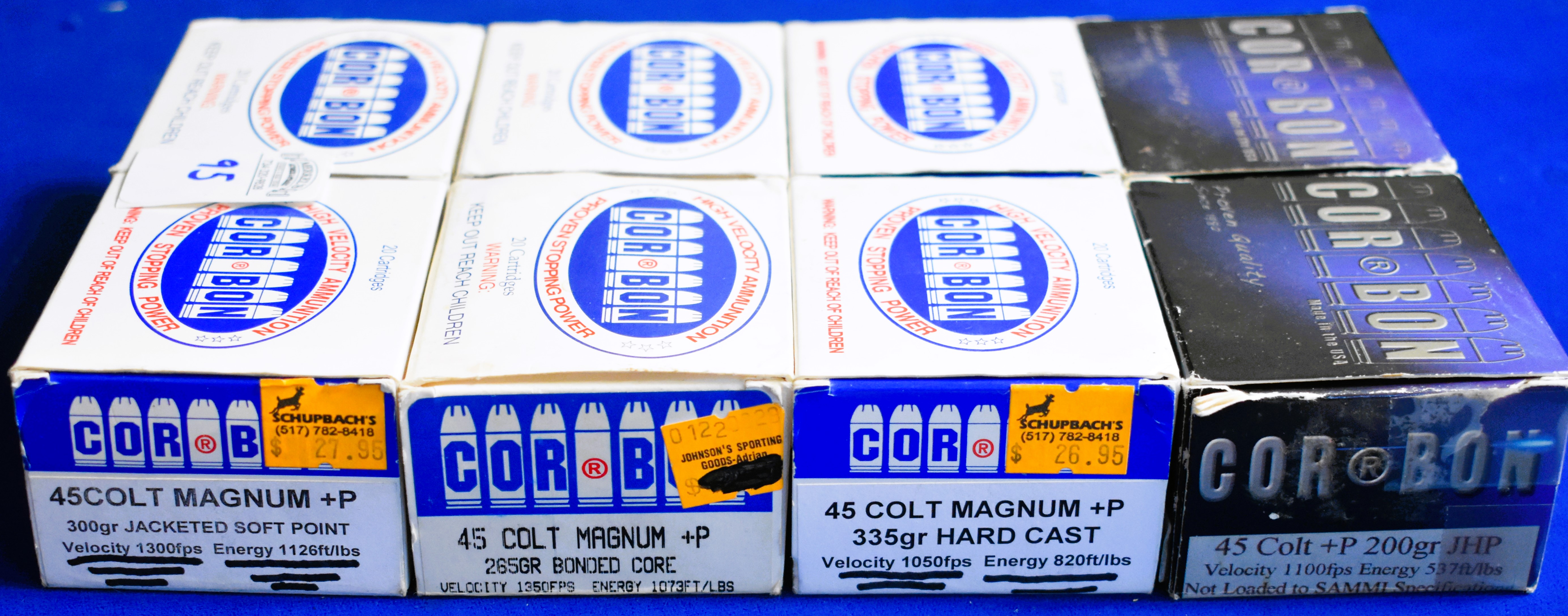 Factory New Old Stock -160 Rounds (8 Boxes) Corbon 45 Colt Magnum +P, various grains, please see pictures to determine which boxes contain which grains. Shipping ONLY UPS GROUND due to regulations.